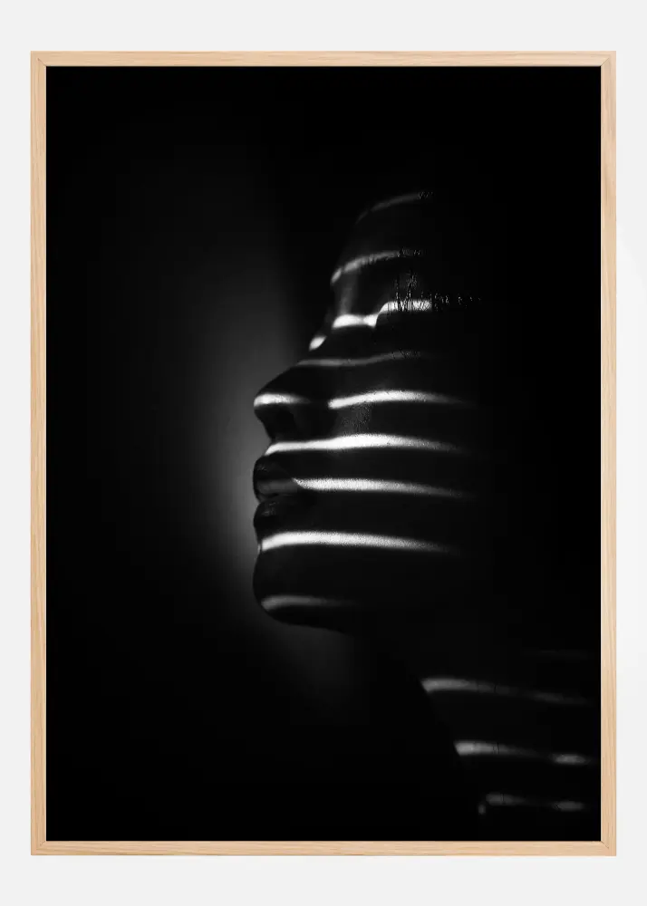 Le portrait spectaculaire d'une femme dans l'ombre avec des faisceaux de lumière blanche brillante qui se posent en bandes sur son visage. La plupart de ses traits sont masqués par l'obscurité alors qu'elle regarde au loin. Ajoutez une touche de drame à vos murs et associez cette affiche à une couleur vive chez vous.