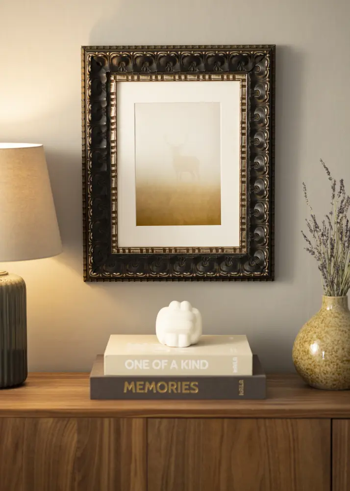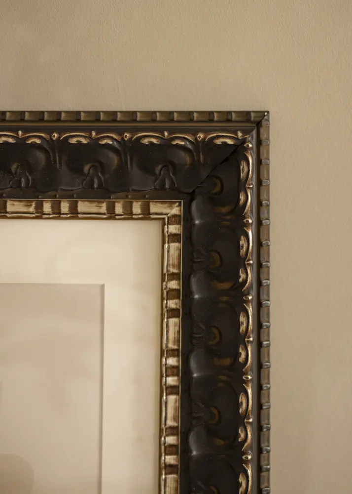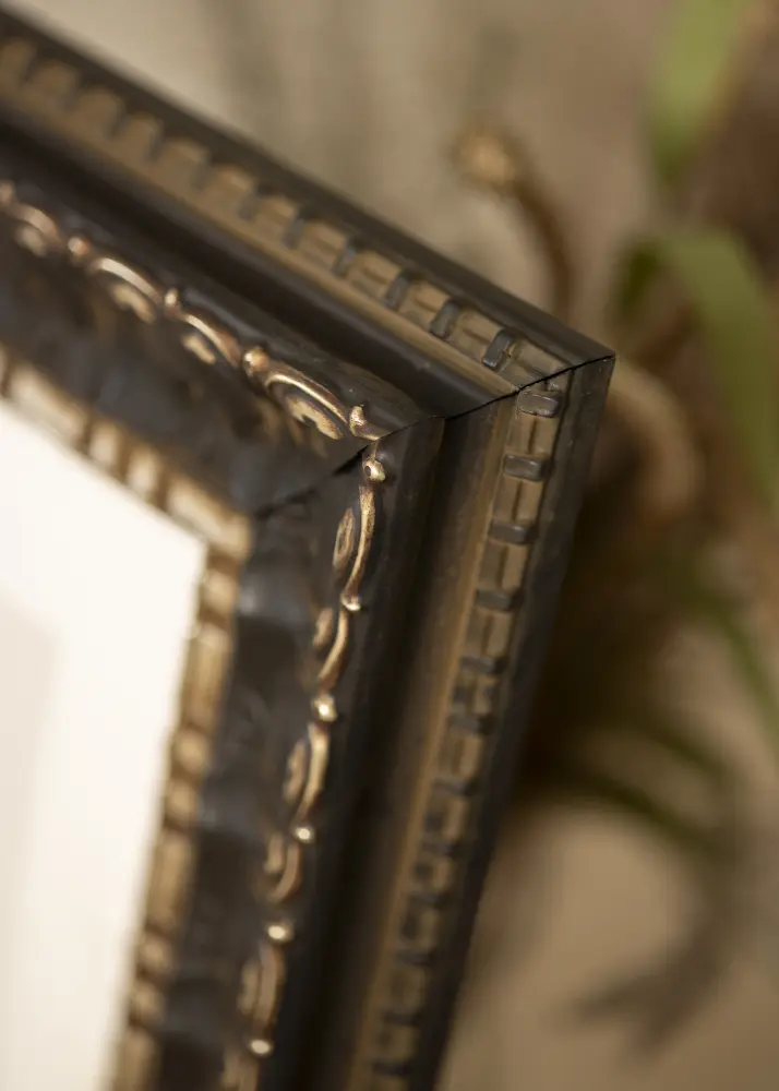 Cadre Skokloster Noir est un cadre photo élégant et classique qui offre un encadrement parfait pour vos photos ou œuvres d'art. Avec sa base noire profonde et ses détails dorés antiques, ce cadre crée une sensation sophistiquée et luxueuse dans n'importe quelle pièce où il est placé. Les motifs détaillés le long des bords ajoutent une couche supplémentaire d'élégance et font que le cadre se distingue vraiment.