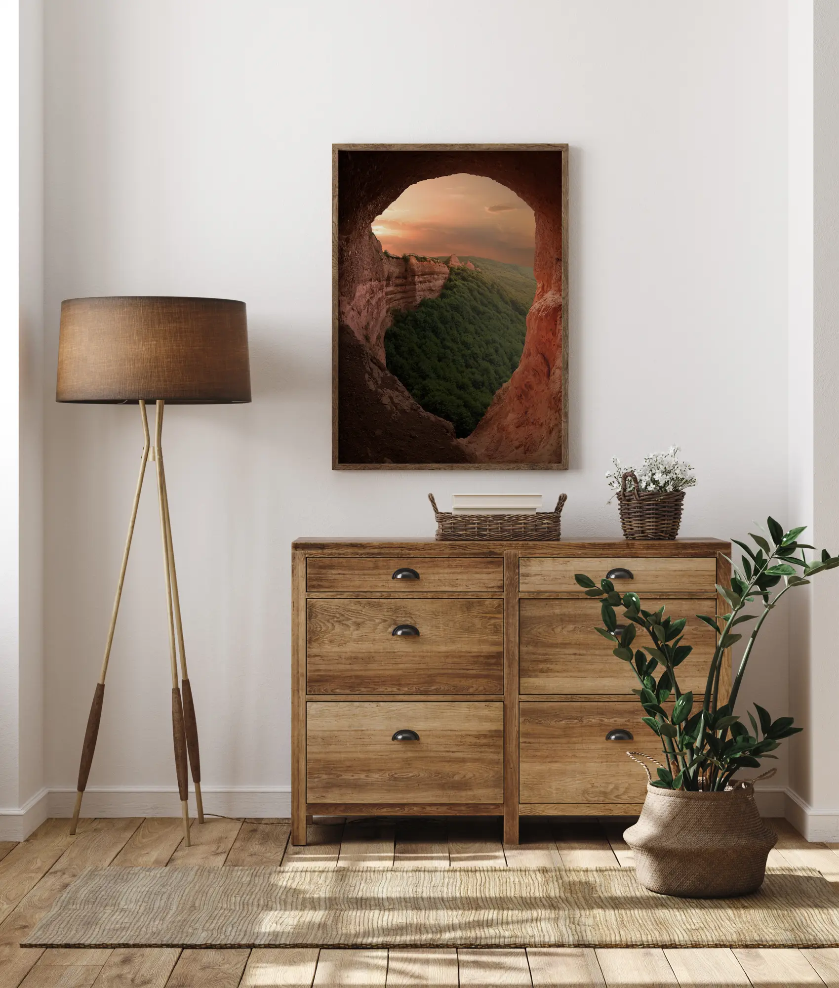 Une affiche impressionnante d'un paysage rouge spectaculaire. Regardez par l'ouverture dans la falaise pour voir les roches rouges qui s'étendent au loin. Les arbres verts qui poussent forment un contraste parfait, tandis que le soleil couchant jette une lueur chaleureuse sur le tableau. Visitez cette vue depuis le confort de votre maison.