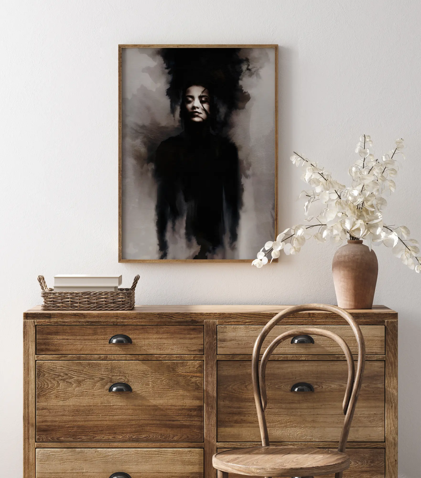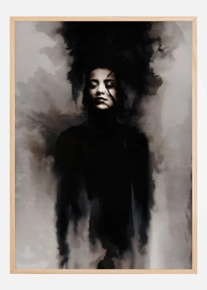 Un étonnant portrait abstrait d'une fille tout en noir. Un effet d'aquarelle est utilisé ici pour créer son corps et ses cheveux. Les couleurs s'étendent doucement sur l'affiche. Seul son visage est détaillé et son expression est calme et sereine, ses yeux fermés. Accrochez cette affiche sur un mur clair pour compléter cette œuvre d'art.