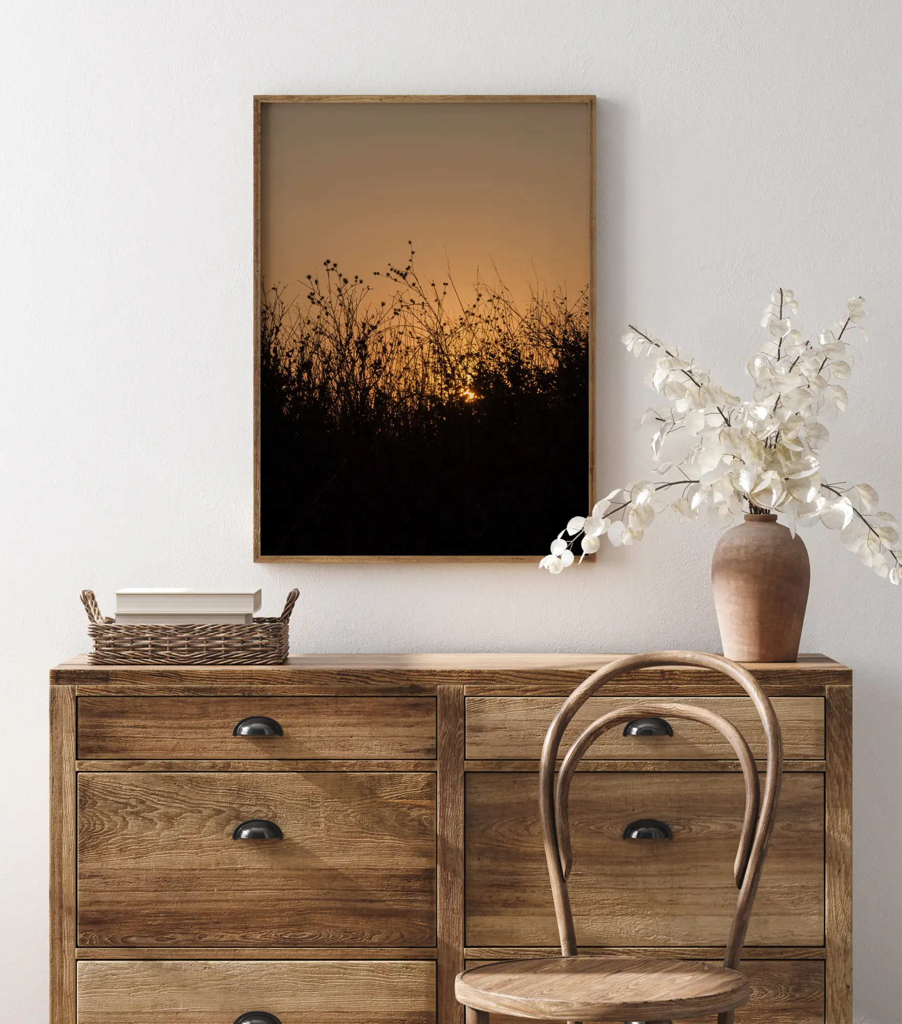Une affiche sur le lever du soleil. Une silhouette sombre de l'herbe crée un aperçu du soleil qui se lève derrière. Le noir de l'herbe est réchauffé par les rayons tièdes qui frappent les tiges. Au-dessus, le ciel commence à s'éclaircir pour le nouveau jour.