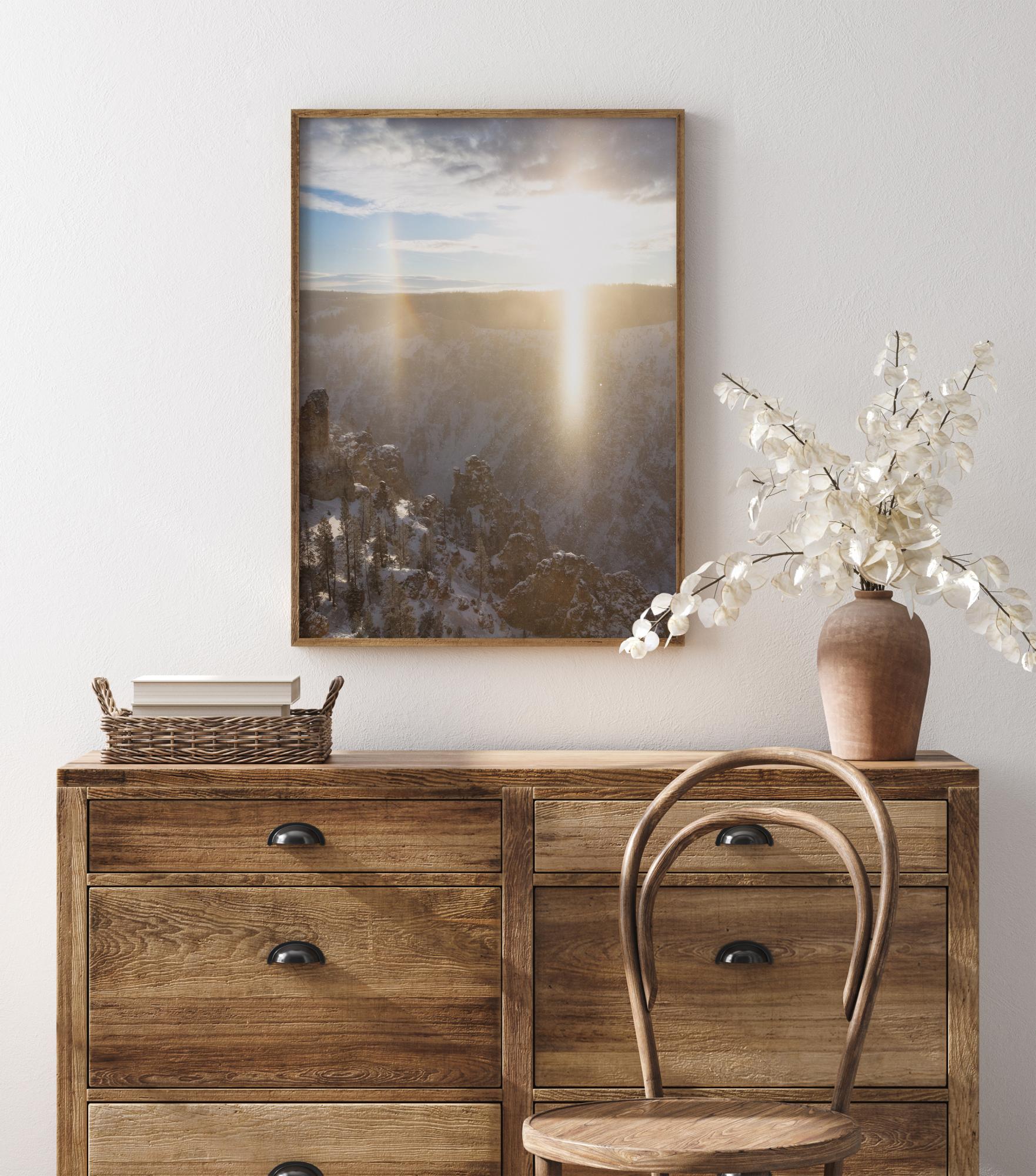 Une affiche du sommet de montagnes enneigées. Le soleil est haut dans le ciel et brille sur les montagnes, créant une lueur vive et un effet de lumière au-dessus des rochers. Les nuages roulent au-dessus de la tête alors que le soleil frappe les sommets enneigés, ce qui donne une image spectaculaire et hivernale.