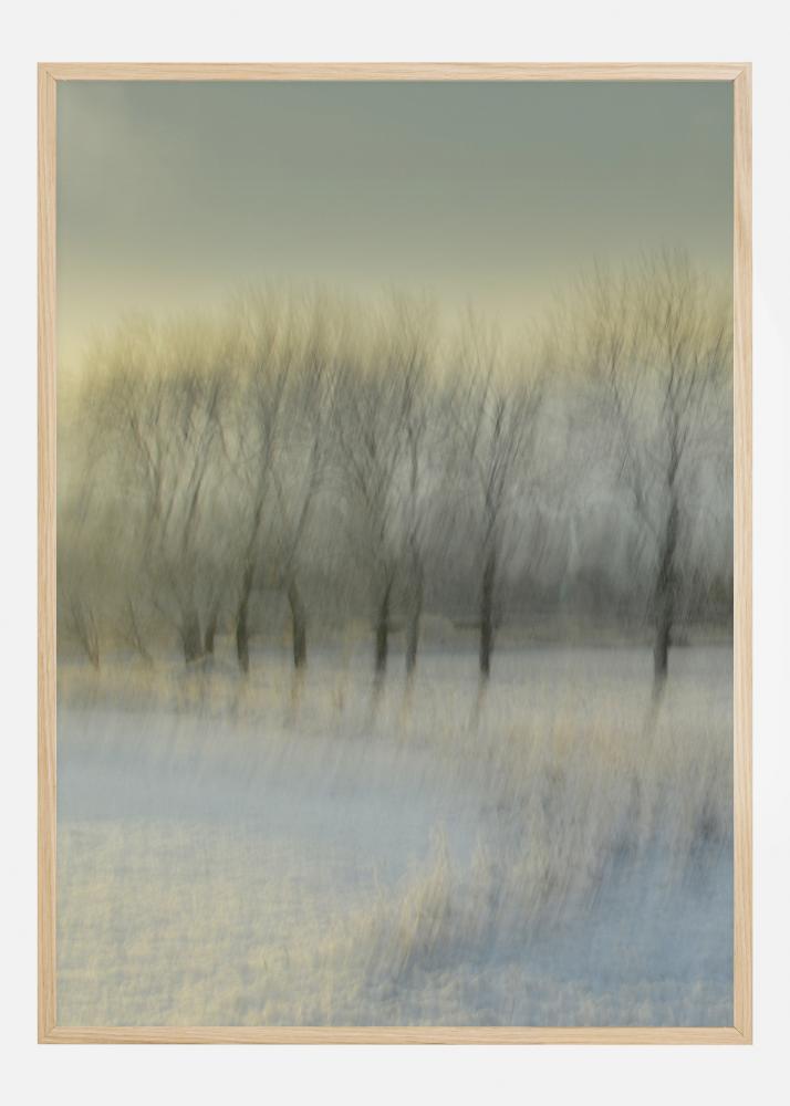 Une affiche étonnante d'arbres sur un fond d'hiver. La neige blanche recouvre tout dans cette image douce et floue. Les arbres sont flous, seuls les grands troncs noirs sont visibles et une bande de jaune doux flotte sur la cime des arbres. La magie est dans l'air.