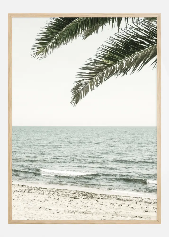 Percevez l'atmosphère paisible d'une escapade tropicale avec cette affiche qui capture la vue des palmes ondoyantes contre un ciel bleu clair et la mer tranquille. La scène de plage apaisante est encadrée par les feuilles vertes vives, créant un effet de fenêtre naturelle et invitant le spectateur à rêver de latitudes plus chaudes.