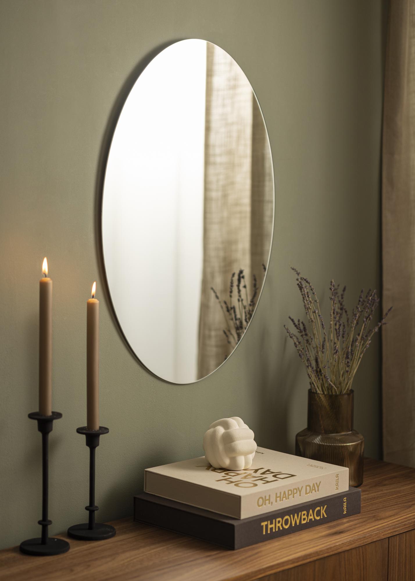 Miroir sans bordure, de forme ovale. Détail d'intérieur parfait dans le salon ou comme petit miroir d'entrée.