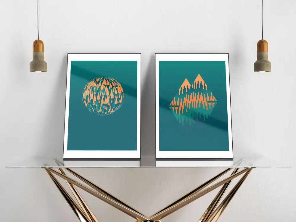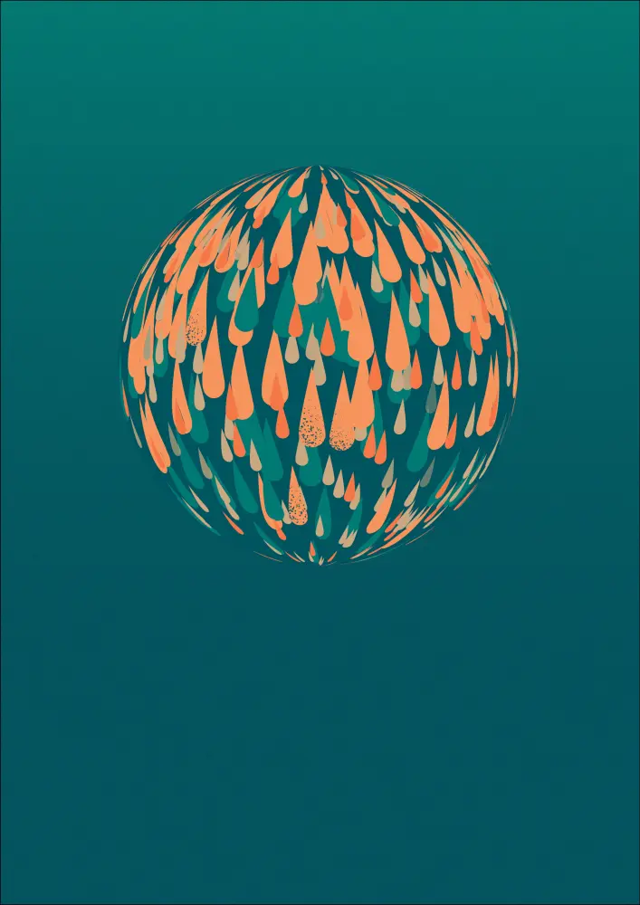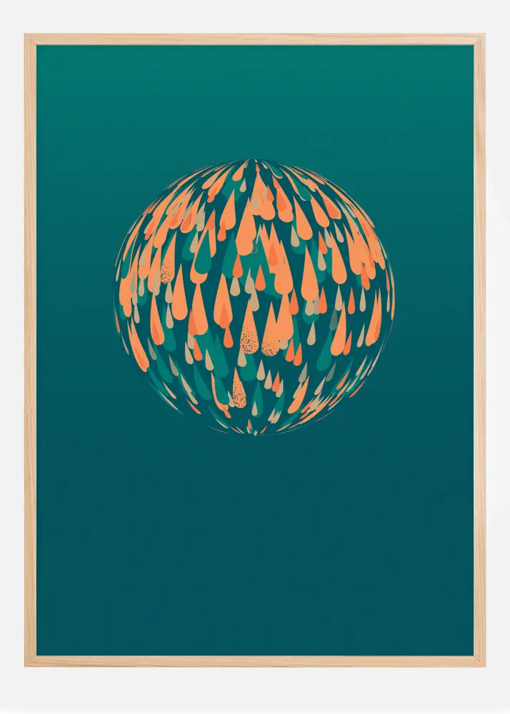 Une affiche lumineuse d'une sphère composée de gouttelettes de couleur vive. Des gouttelettes orange et bleues créent une sphère en 3D sur un superbe fond vert. Simple, mais élégante, cette image est fascinante lorsque vous observez toutes ces gouttelettes se courber sous la sphère. Ajoutez-la à un mur uni pour ne pas dominer les couleurs.