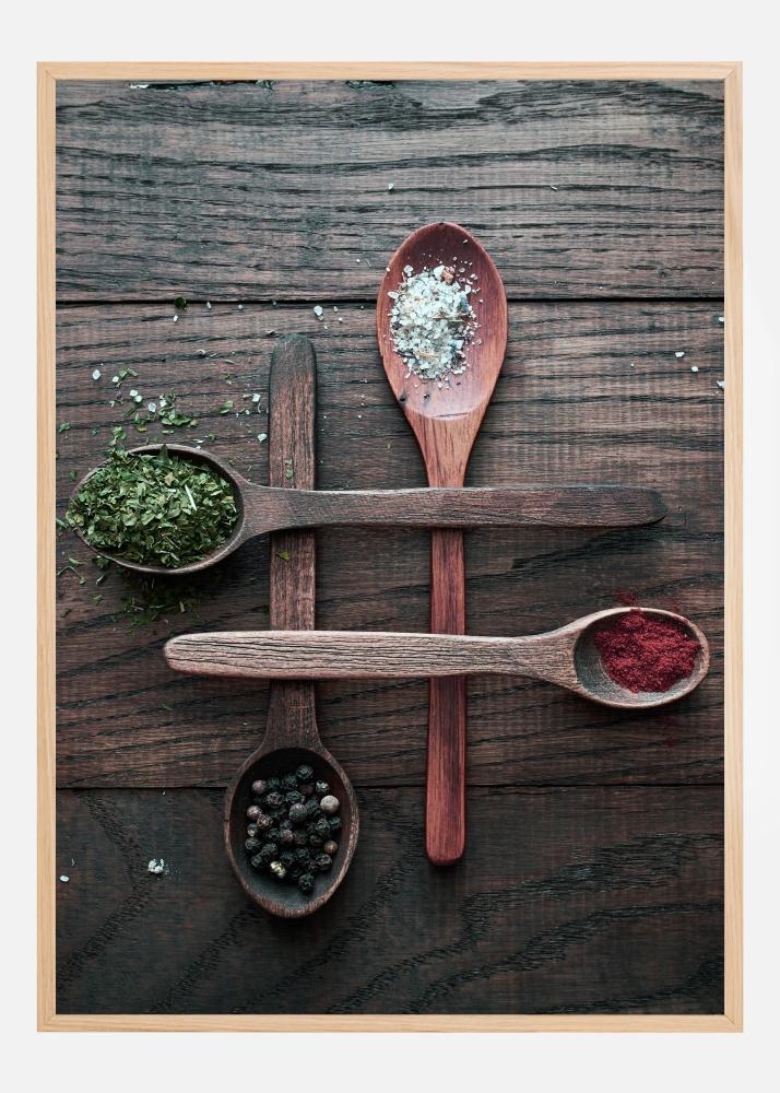 Une affiche de nature morte représentant quatre cuillères en bois contenant chacune une épice différente. Les quatre cuillères s'entrecroisent et forment une grille sur une table en bois rustique. Les herbes et les épices s'échappent de chaque bol, créant une ambiance de cuisine originale, parfaite pour vous donner de l’inspiration en cuisine.