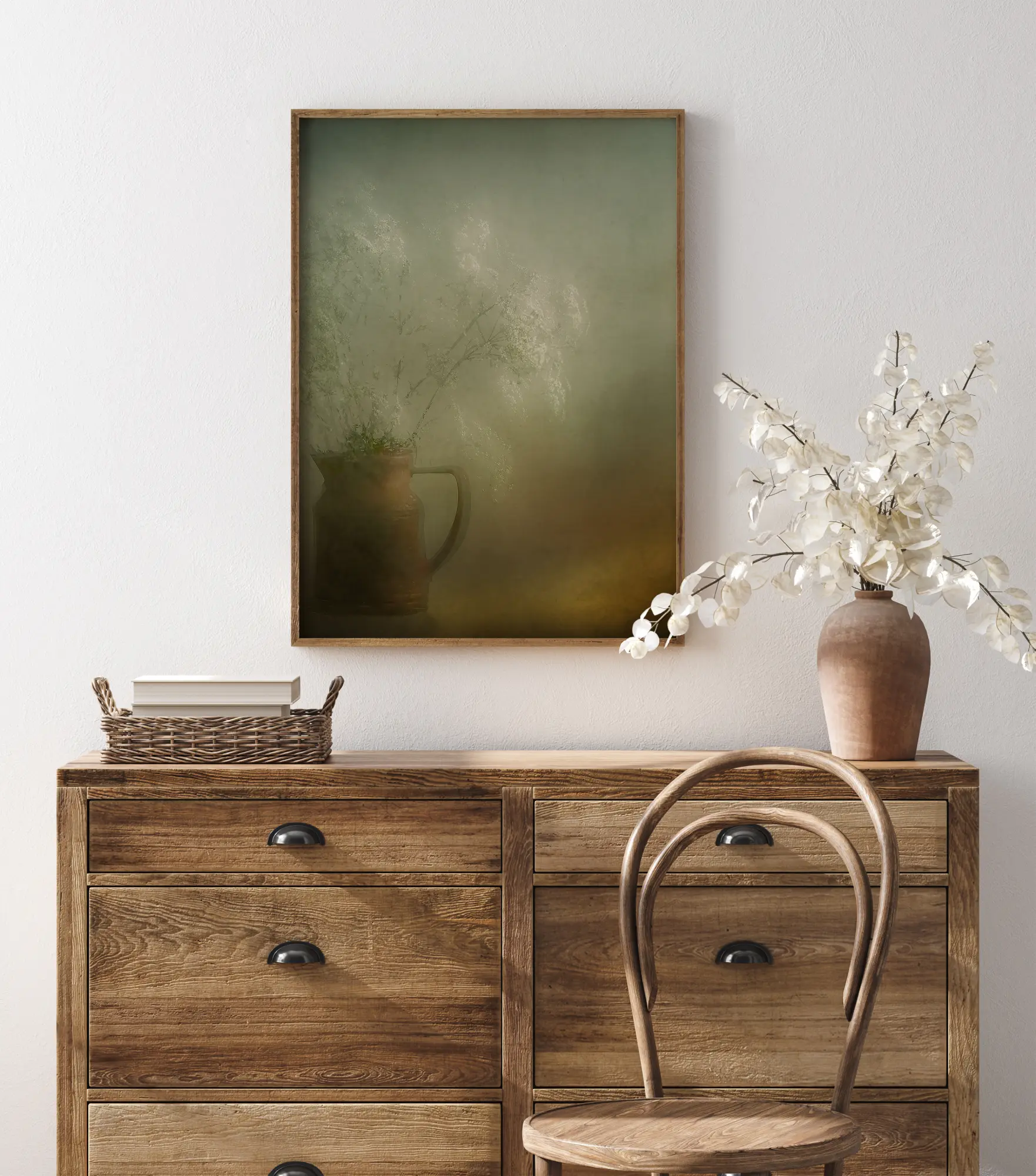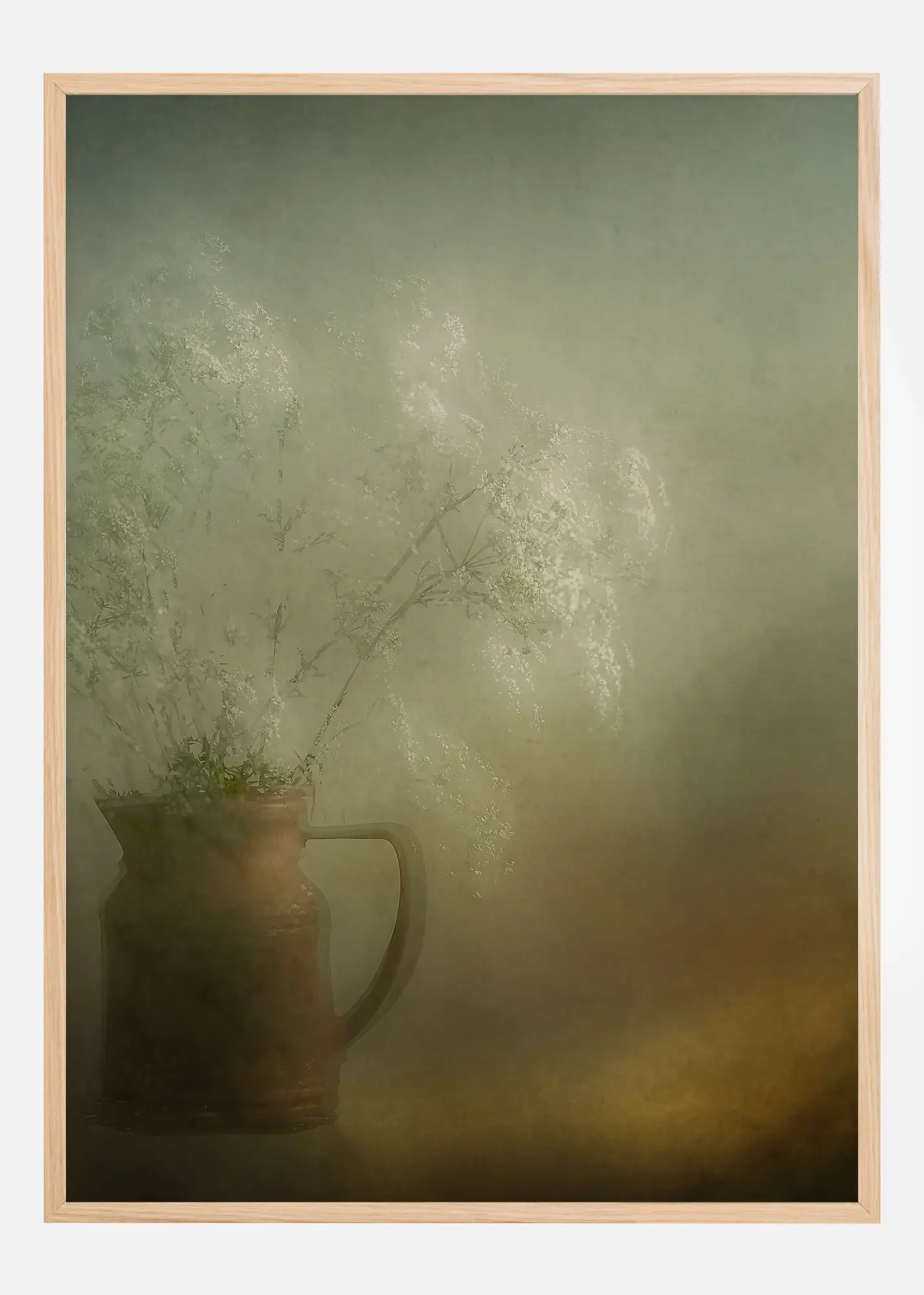 Une nature morte picturale représentant une cruche en faïence brune remplie de fleurs blanches flottant doucement. Ce bouquet printanier ressemble à un nuage et disparaît presque sur le mur gris derrière lui. Une lueur orange ajoute de la chaleur en bas de l’affiche, là où se trouve la cruche.