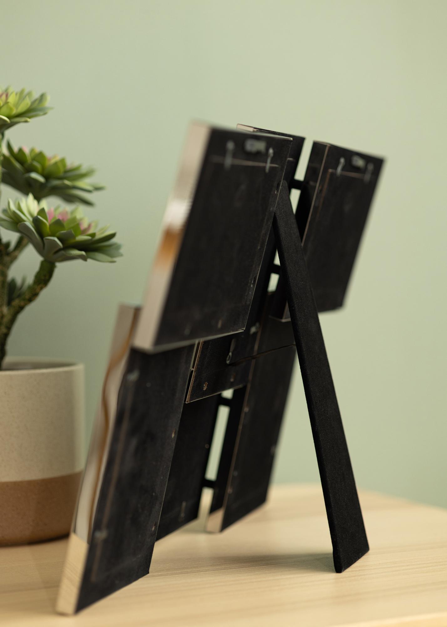 Le cadre peut contenir trois photographies dans un format portrait et trois photographies dans un format paysage. Pour insérer les images dans le cadre il suffit de tourner les petites broches métalliques situées à l'arrière du cadre, de retirer le carton de fond et d'insérer votre image derrière le verre. Chaque image a son propre petit carton de fond pour que vous puissiez facilement placer ou changer une image à la fois.