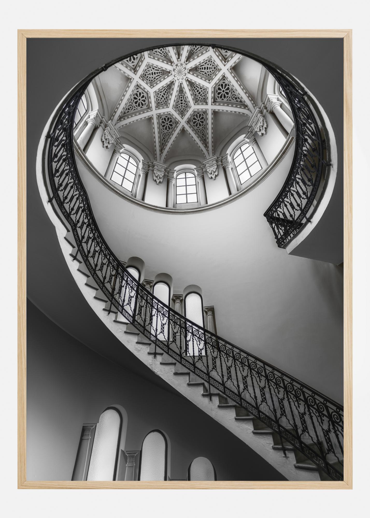 Une affiche de l'intérieur d'un bâtiment. Un escalier en colimaçon avec des rampes complexes en fer forgé s'élève vers le plafond. Votre regard est attiré par le dôme avec un étonnant motif de treillis et des fenêtres lumineuses qui laissent entrer la lumière. L'élégance et les détails se combinent dans cette image en noir et blanc.