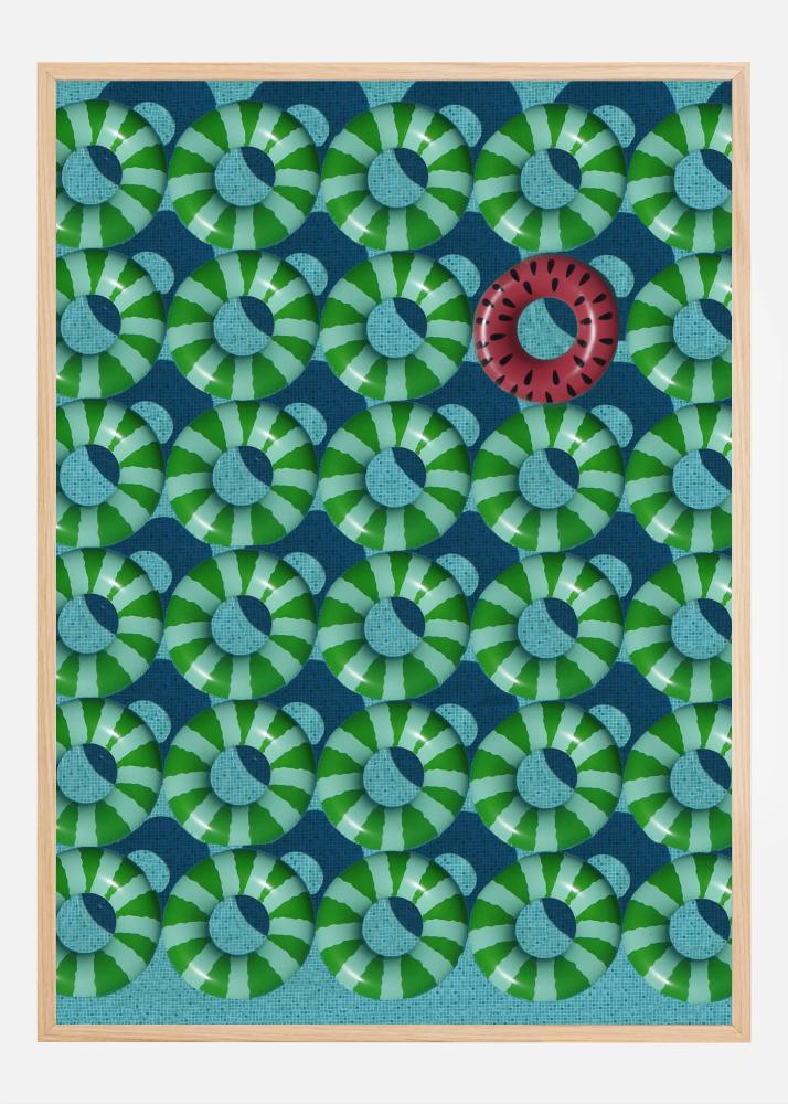 Ce poster ludique et coloré est un hommage à l'individualité et à l'originalité. Dans une mer de bouées identiques vertes et blanches, une seule bouée pastèque attire l'attention et offre un sentiment immédiat de joie et d'amusement. Cette impression est un compagnon d'été parfait, qui met en valeur l'unicité de se démarquer de la foule.