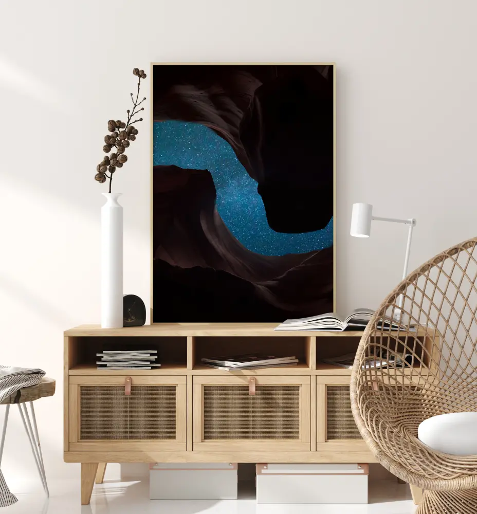 Une magnifique affiche nocturne du ciel étoilé qui se détache des formations rocheuses spectaculaires. Les roches d'un rouge profond tourbillonnent en haut et en bas de cette photo. Un chemin étoilé qui permet au ciel nocturne de briller apparaît . Cette affiche vivante est conçue pour susciter l'admiration.