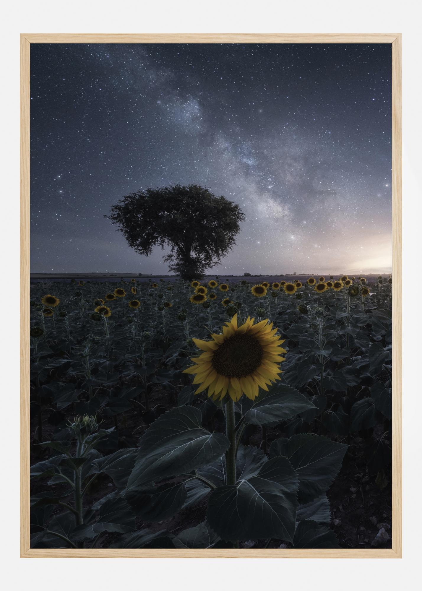 Un poster floral de tournesols la nuit. Le champ de tournesols présente des fleurs jaune vif sur fond de ciel nocturne. Cette image est reflétée par le coucher de soleil au loin qui illumine encore les fleurs, mais qui éclaire aussi le ciel pour que les étoiles soient visibles. Une affiche mystique remplie de fleurs étoilées.