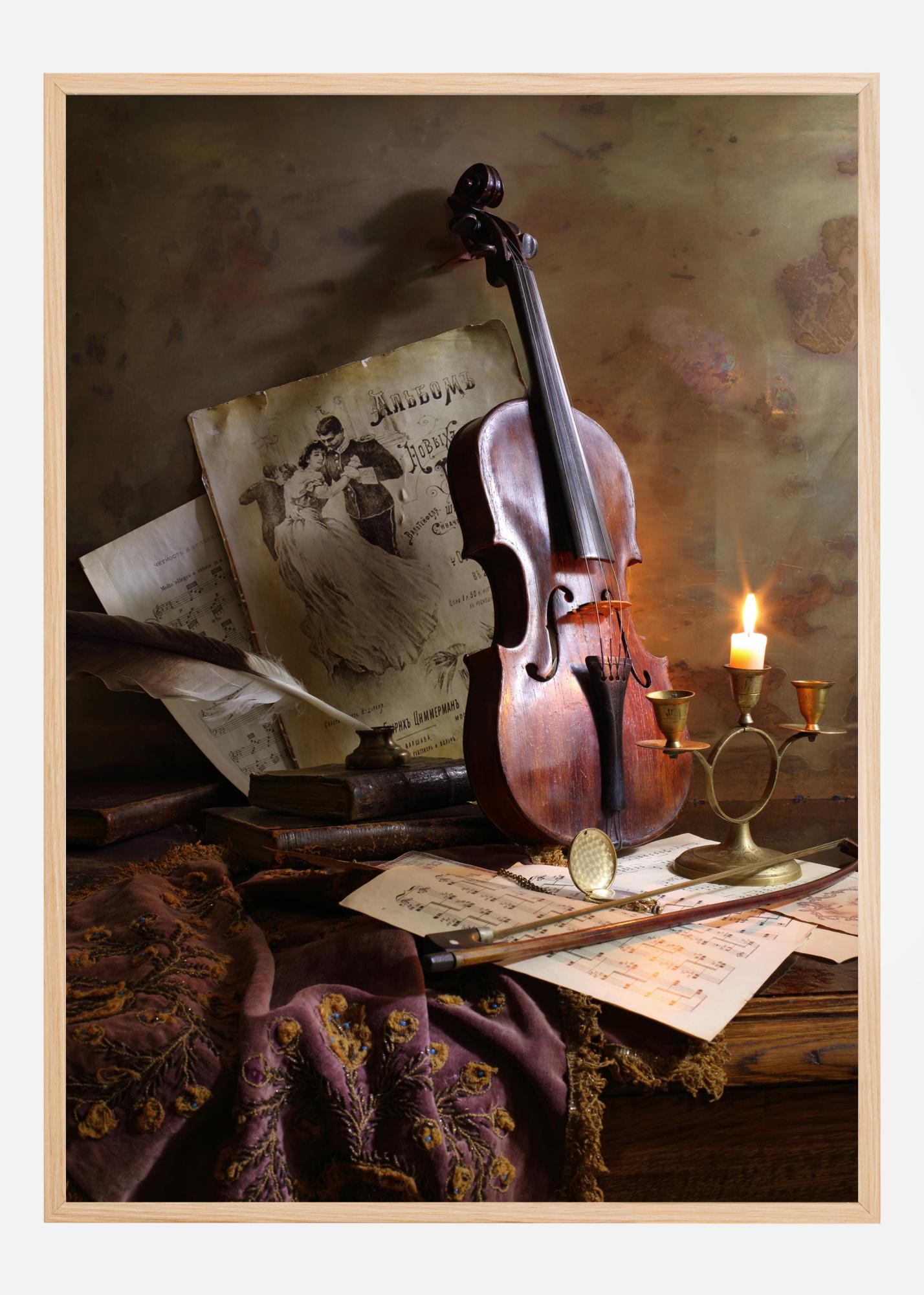Une affiche représentant un violon et des feuilles de musique. Une bougie douce brûle et illumine la couleur acajou du violon, appuyé contre le mur. Un chiffon, des feuilles de musique, une plume, un archet et d'autres accessoires complètent la scène pour donner une impression de chaleur et de richesse à la pièce.