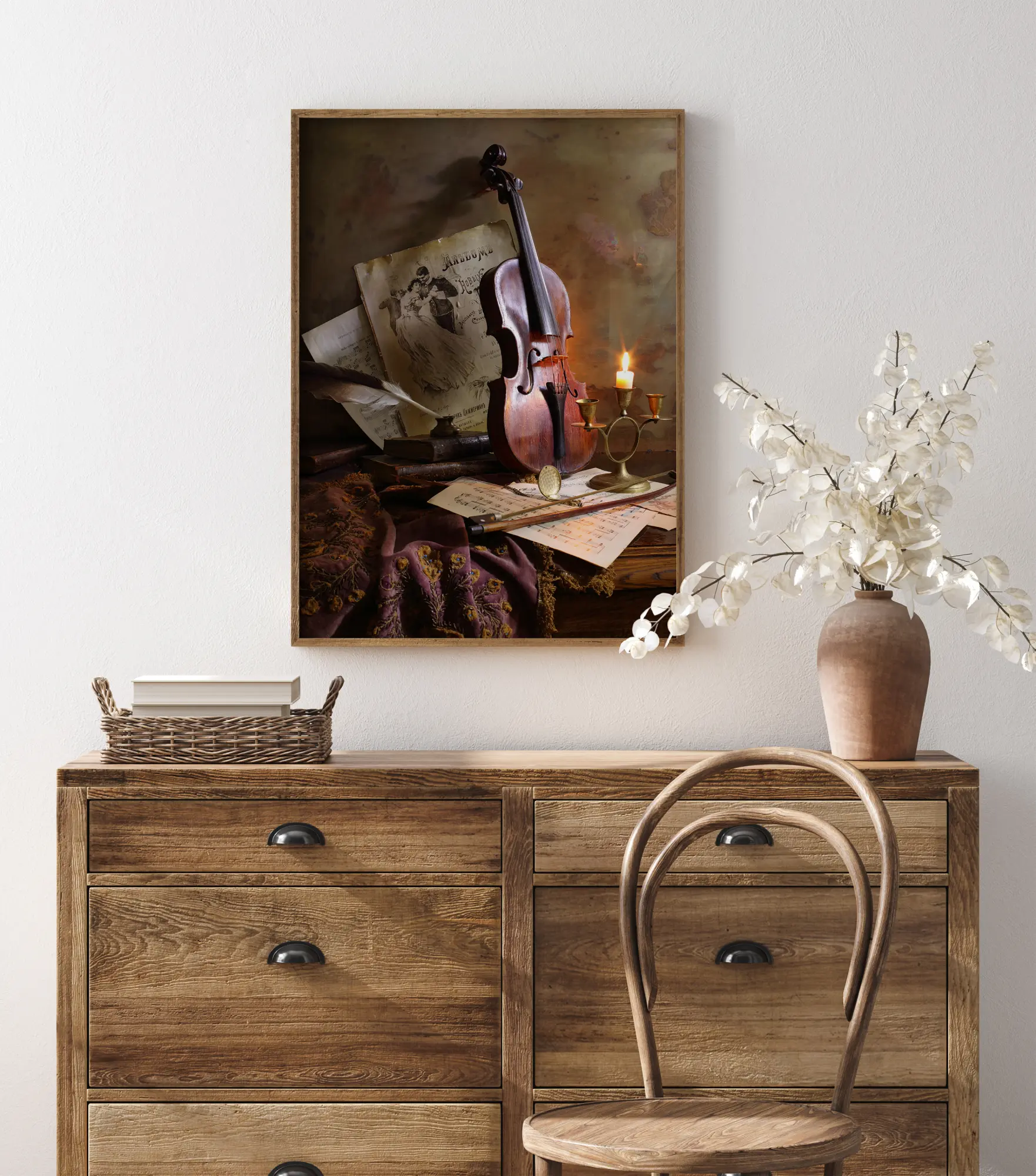 Une affiche représentant un violon et des feuilles de musique. Une bougie douce brûle et illumine la couleur acajou du violon, appuyé contre le mur. Un chiffon, des feuilles de musique, une plume, un archet et d'autres accessoires complètent la scène pour donner une impression de chaleur et de richesse à la pièce.