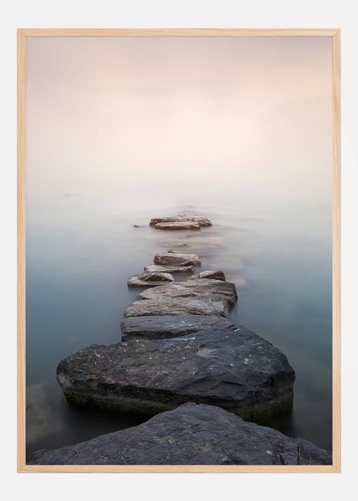 Une affiche représentant des tremplins traversant un lac vers l'inconnu. De grandes pierres mènent à un monde brumeux au-delà. Des bleus et des roses doux donnent à cette image une touche magique. Faites le premier pas et voyez où vos pieds vous mènent.