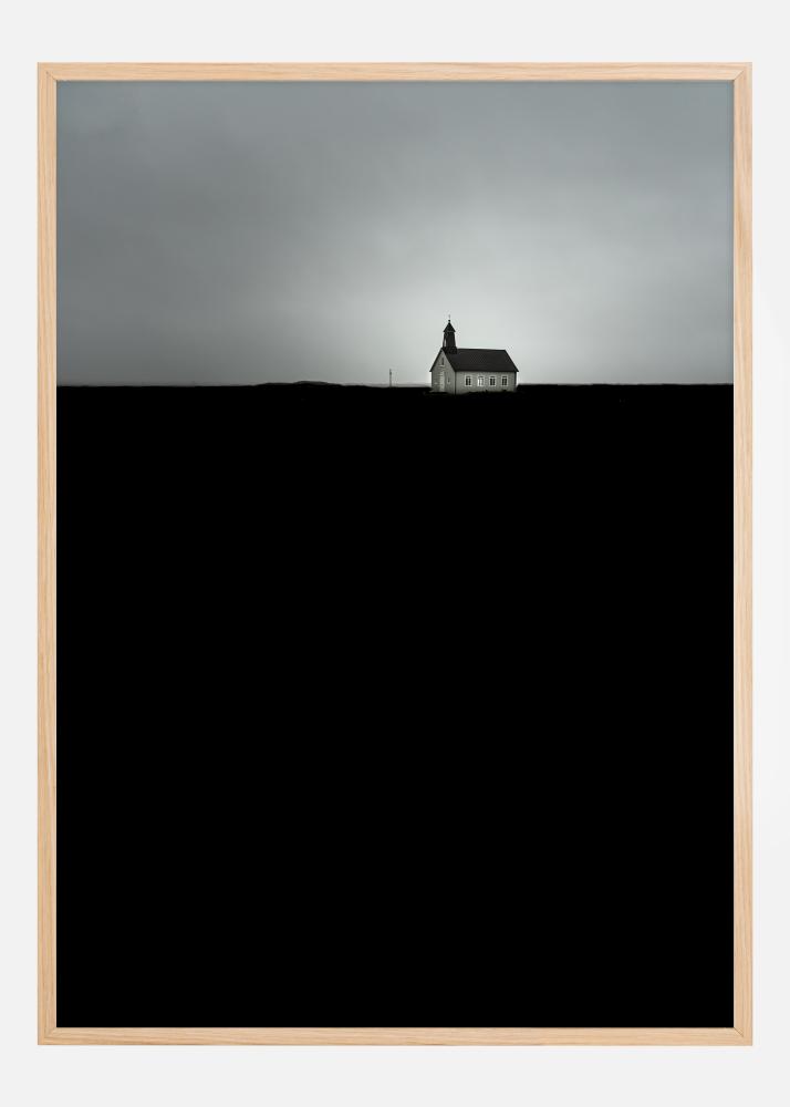 Cette affiche offre une image forte et atmosphérique de Strandarkirkja, une église solitaire se dressant contre un ciel dramatique. La silhouette sombre du paysage crée un contraste net avec le ciel gris, donnant une impression d'isolement et de tranquillité. Les murs blancs de l'église illuminent le paysage et offrent un symbole d'espoir et de guidance dans l'obscurité environnante.
