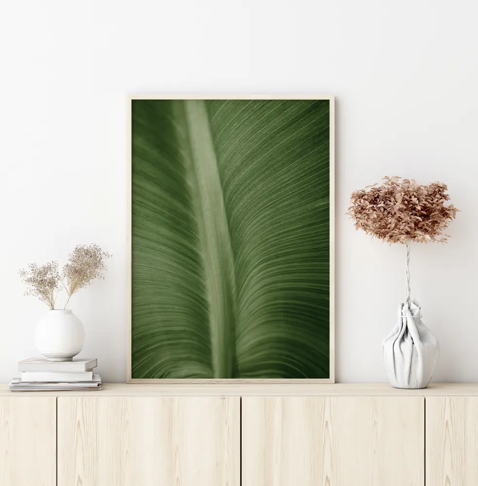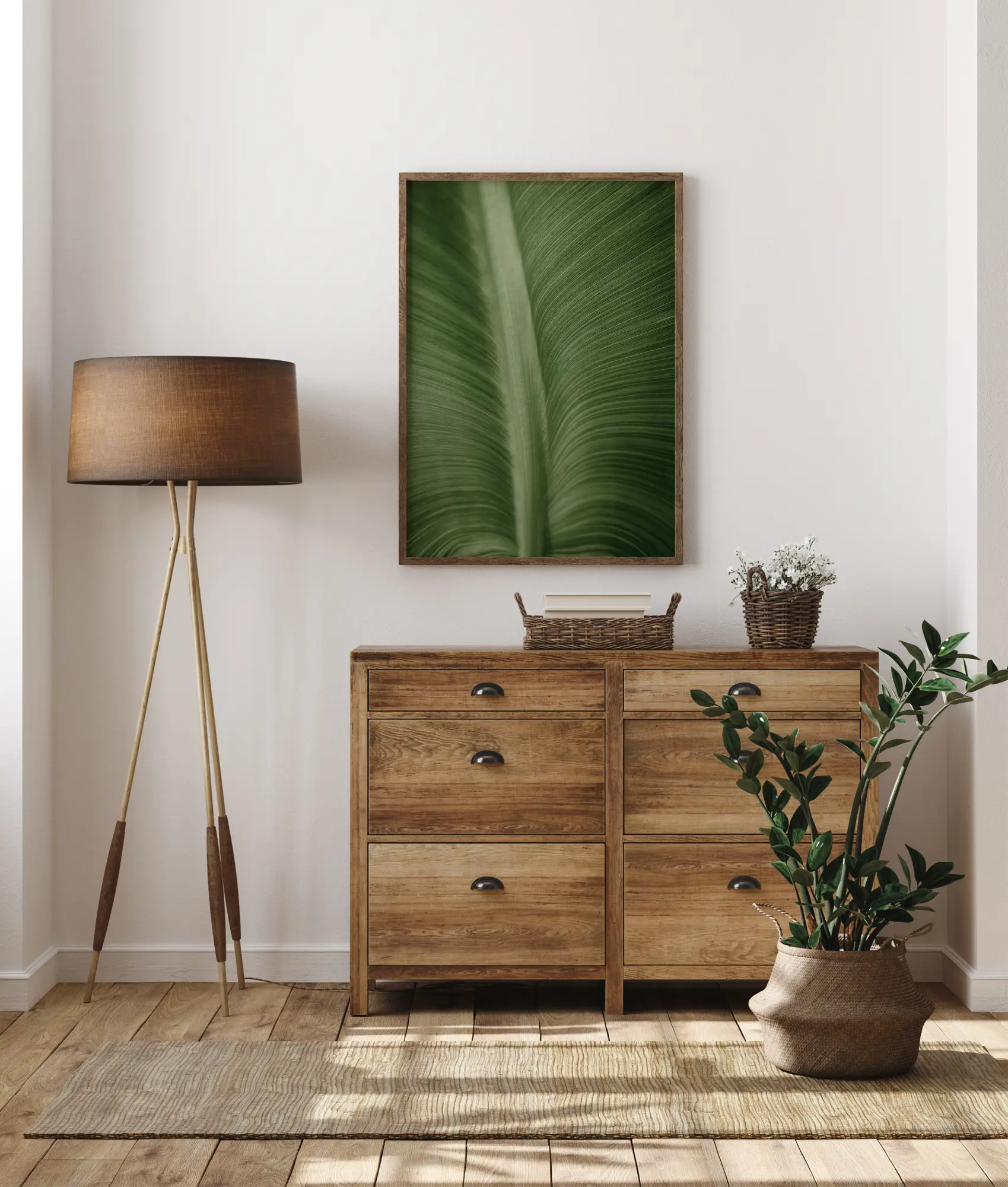 Une affiche macro d'une feuille montrant la structure des veines et de la nervure. De magnifiques verts luxuriants remplissent cette image pour un effet très apaisant. Les fines nervures s'incurvent doucement vers l'extérieur, loin de la nervure centrale épaisse de la feuille. Plongez dans la nature avec ce gros plan.