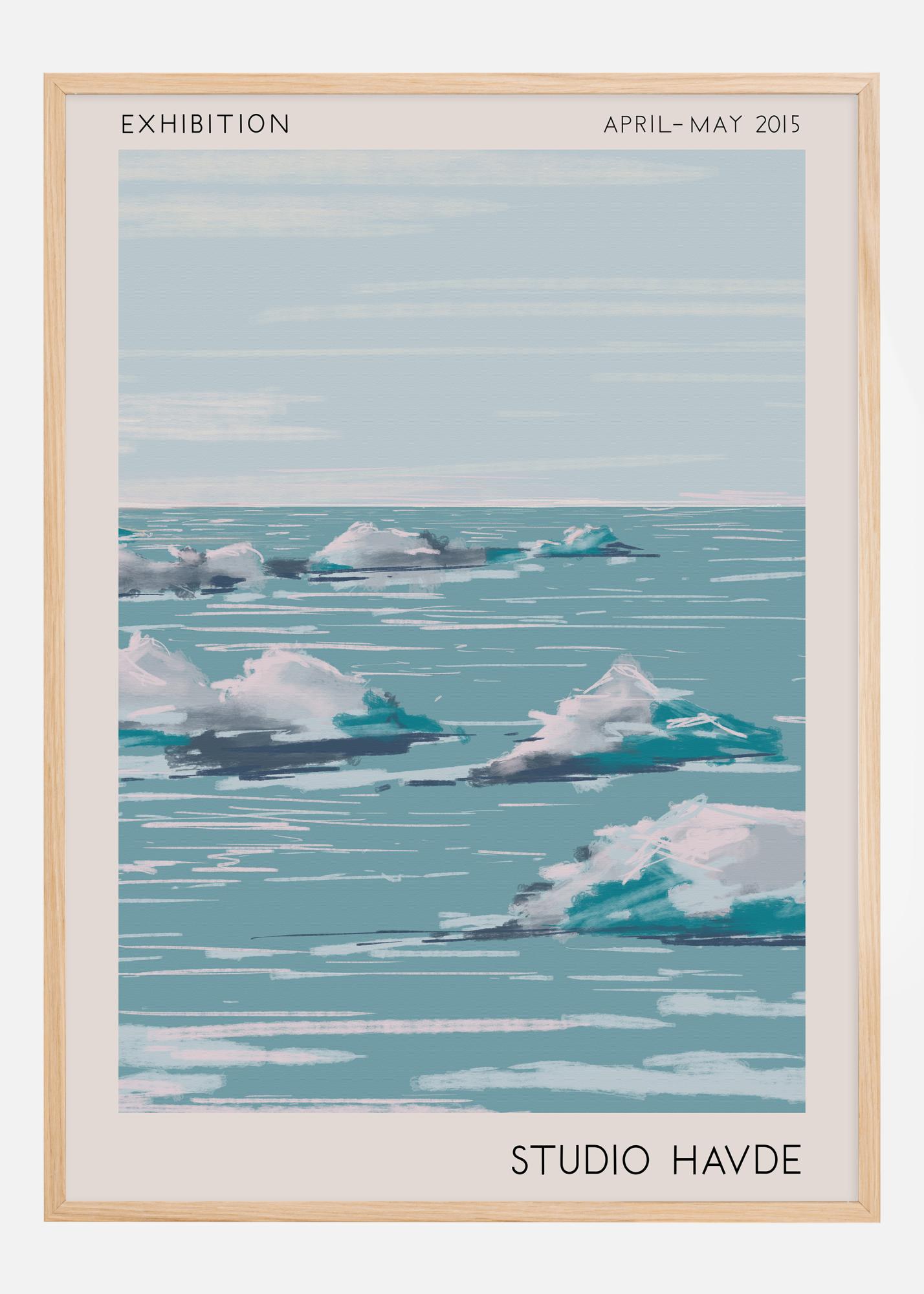 Ce poster paisible et atmosphérique de l'exposition d'avril-mai 2015 de Studio Havde transmet une forte sensation de la nature changeante et puissante de la mer. L'œuvre représente une série d'icebergs perçant la surface calme de la mer, peinte dans une palette relaxante de bleus froids et de tons blancs doux qui créent une sensation de froid et de tranquillité dans la composition. Cette scène de paysage arctique est à la fois intemporelle et actuelle, et reflète la force indomptable et la beauté de la nature.