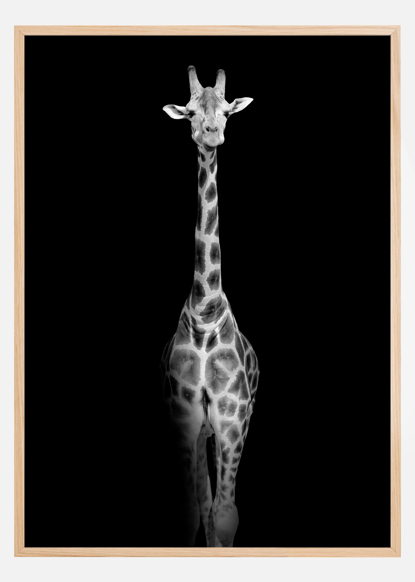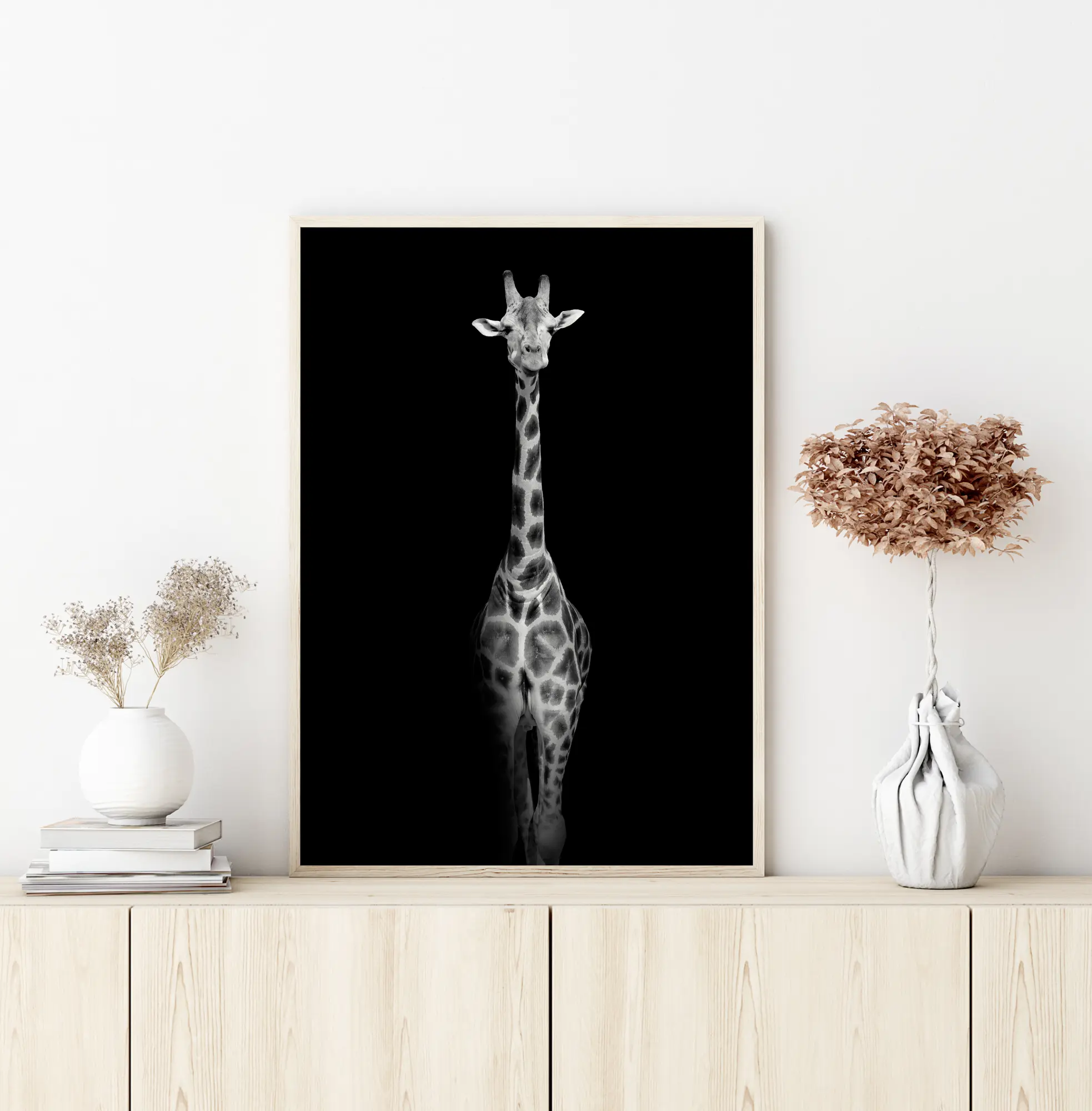 Art photographique en noir et blanc d'une girafe élancée émergeant du fond noir de l'image. Un poster épuré et contrasté avec une profondeur merveilleuse. Associez-le volontiers avec d'autres de nos beaux posters d'animaux dans le même style pour créer un mur de tableaux sur le même thème.
