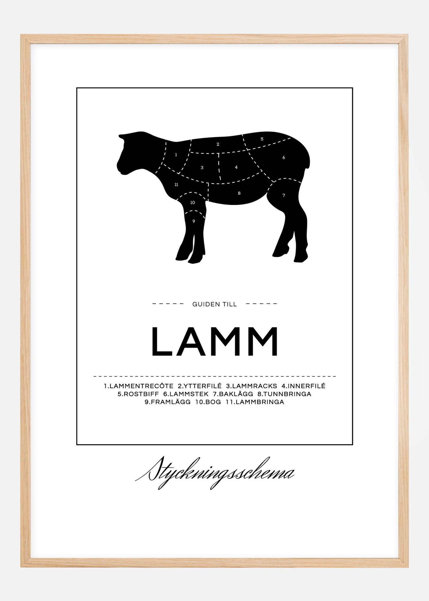 Apprenez où trouver toutes les délicatesses du mouton avec ce poster élégant sur votre mur. Le poster représente un mouton noir divisé en marquages qui montrent où par exemple le filet extérieur, les racks d'agneau et l'épaule sont prélevés. En complément de l'image, le texte "Le guide de l'agneau" est présenté avec une liste numérotée soignée des différentes parties. Autour du texte et de l'image, un mince rectangle est tracé et sous le rectangle, il y a une affiche avec le texte "Schéma de découpe".