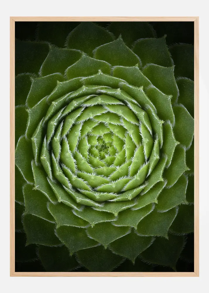 Une affiche en gros plan d'une succulente. Des feuilles d'un vert éclatant se déploient en spirale en forme de rose. Les sommets de chaque feuille de la plante sont très détaillés et de minuscules pointes blanches sont visibles lorsque vous regardez tous les anneaux. Une jolie affiche d’un vert éclatant.