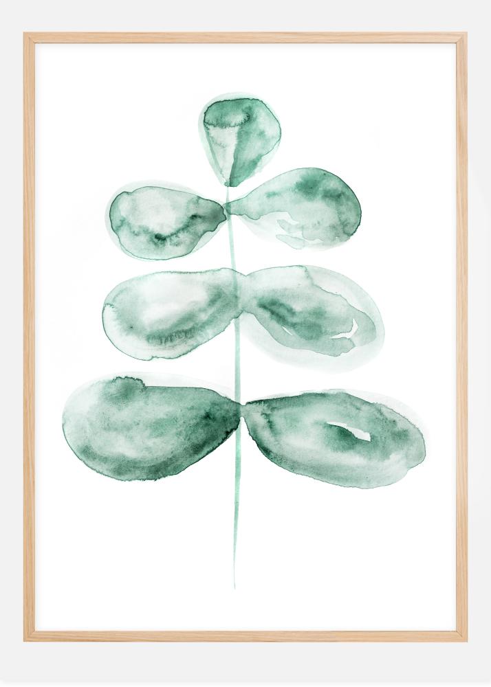 Une affiche simple de feuilles bleu-vert peintes à l'aquarelle. La couleur s'étend dans chaque feuille, laissant les bords doux et flous pour un aspect pictural. Une fine tige relie les feuilles entre elles pour former un ensemble cohérent dans cette peinture élégante. Associez-la à des pastels doux pour compléter l'ambiance estivale.