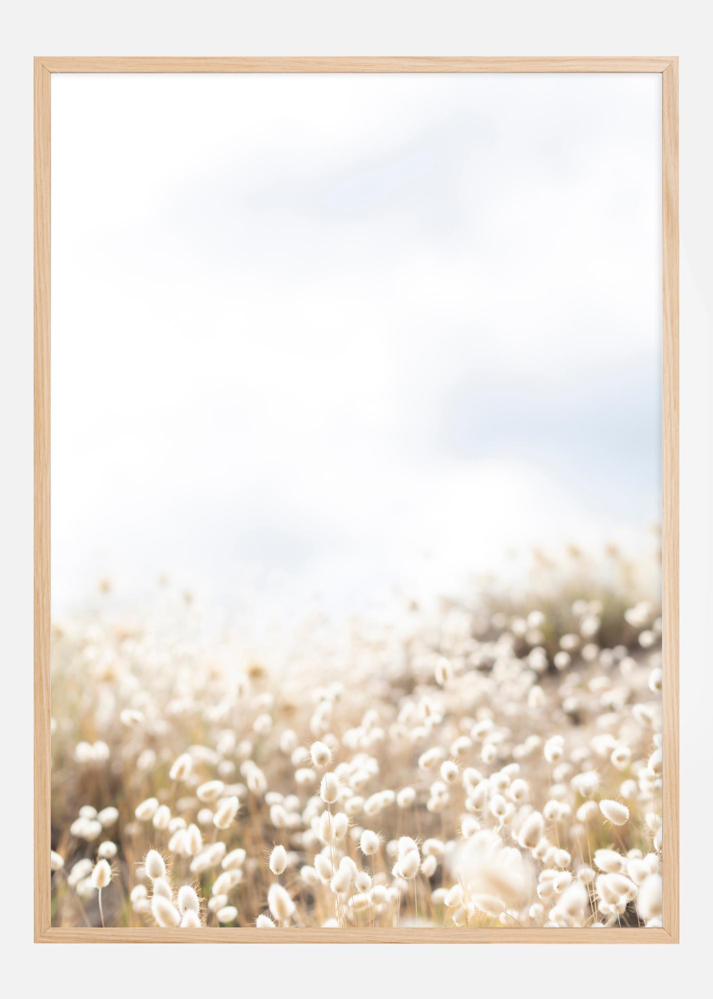Cette affiche onirique capture un champ rempli de fleurs légères et duveteuses baignant dans une douce lumière solaire. Le motif, imprégné de nature et de tranquillité, transmet une sensation de chaleur et de calme. Les têtes délicates des fleurs blanches se balancent dans la brise paisible, et l'image est drapée en tons pastel de jaune, beige et blanc qui se fondent avec le ciel bleu clair.
