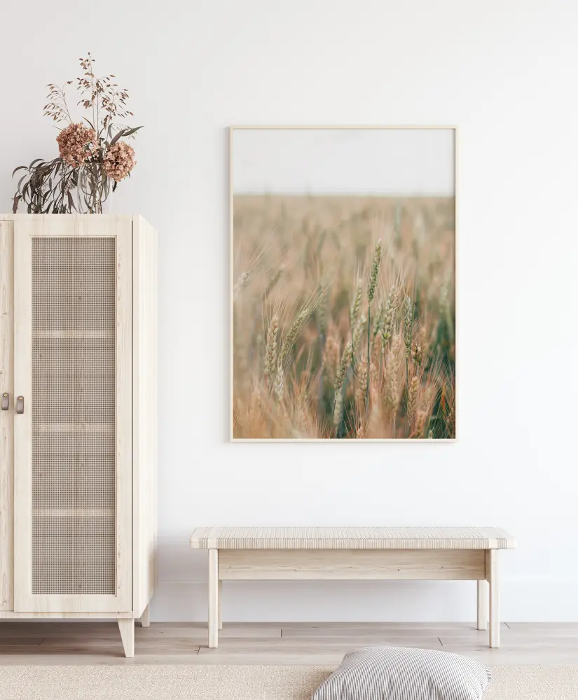 Une affiche agricole d'un large champ de blé. De près, on peut voir les différents épis de blé. Le champ s'étend au loin et s'estompe au fur et à mesure pour créer de la profondeur. Un mélange d'or et de verts étonnants, qui donnent une ambiance vraiment estivale.