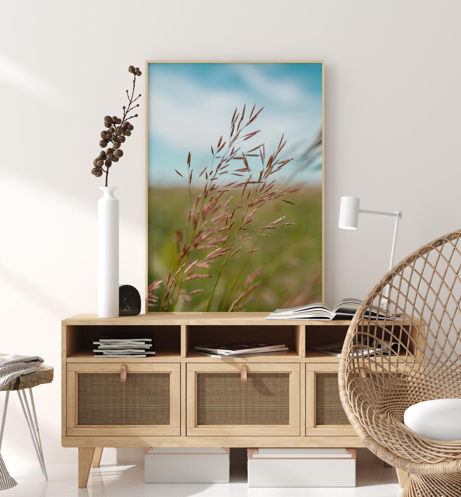 Une affiche lumineuse d'un champ vert avec un gros plan de graines d'herbe sur une longue tige. Le rouge rosé de la graine d'herbe est mis en valeur par le vert vif du champ. Un ciel bleu avec de doux nuages blancs rend cette journée très estivale. Cette scène joyeuse égayera n'importe quelle pièce.