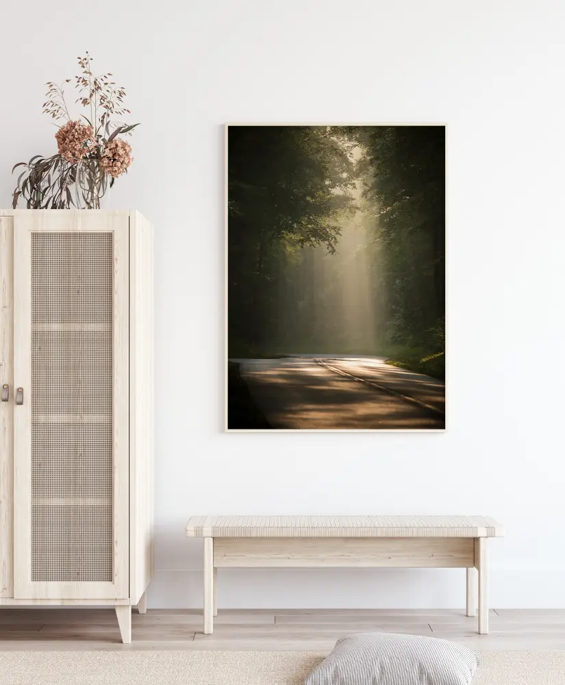 Une affiche paisible d'une route qui serpente entre de grands arbres verts dans une forêt. Un rayon de lumière dorée descend du ciel et crée des motifs pailletés sur la route. Suivez-la à travers cette forêt pour un voyage vraiment paisible.