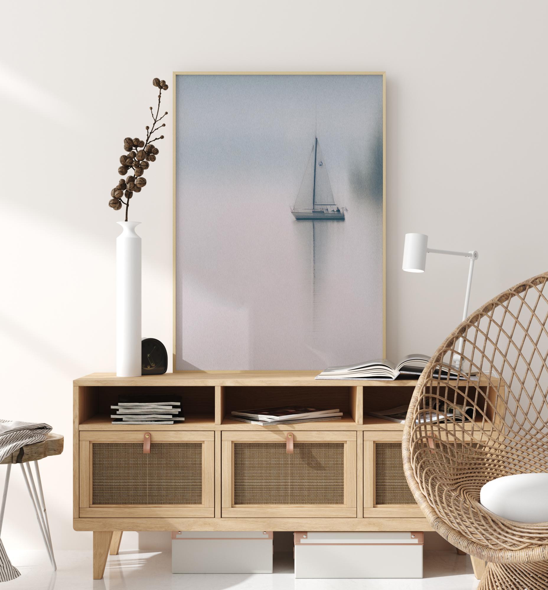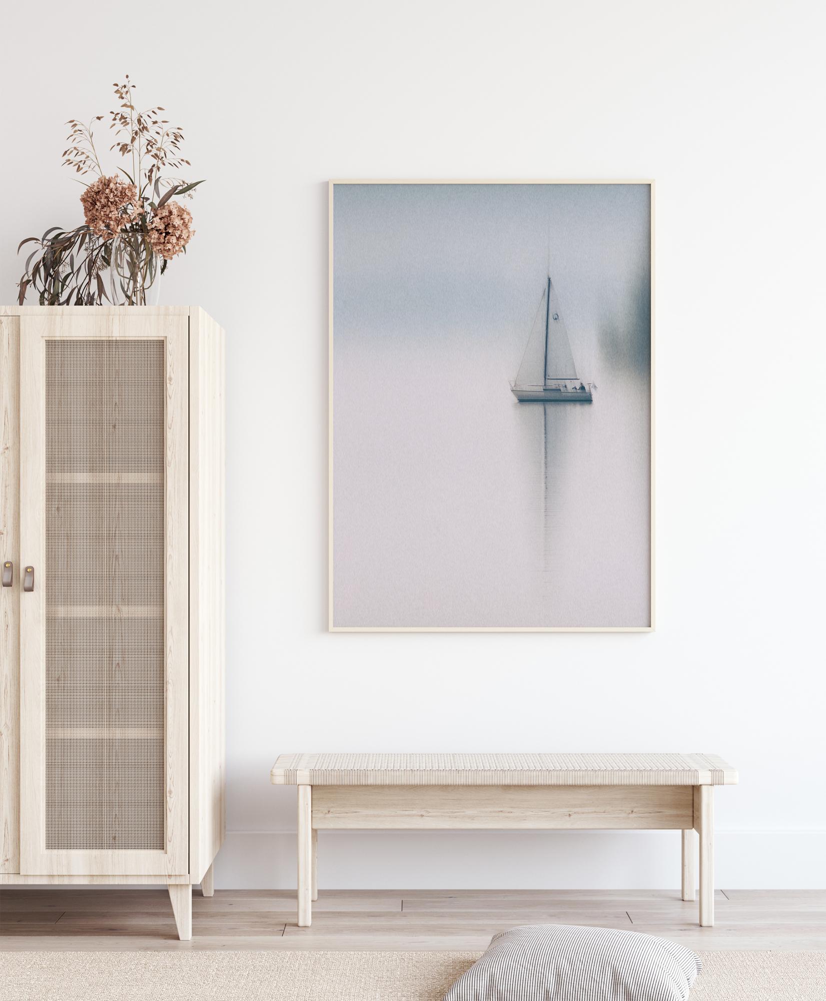 Une affiche apaisante d'un yacht au milieu d'un lac blanc pâle. L'image est douce avec des bords flous pour toutes les images. La voile du bateau est allongée sur l'eau pendant qu'il glisse dans la brume bleu pâle et grise d'un dimanche matin.