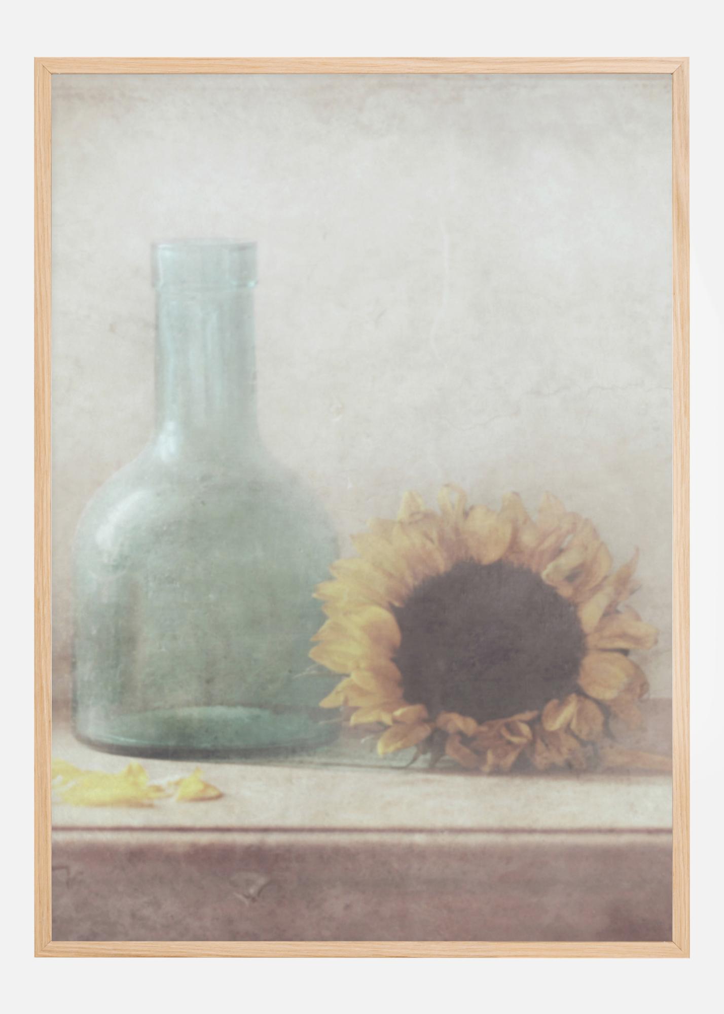 Une affiche classique d'une bouteille en verre et la tête d'un tournesol. Enveloppée d'un doux flou, cette image de nature morte est douce et paisible. Les pétales jaunes s'enroulent doucement tandis que la tête de la fleur repose sur l'étagère. Ajoutez ce doux imprimé pastel à un mur neutre pour un effet apaisant.