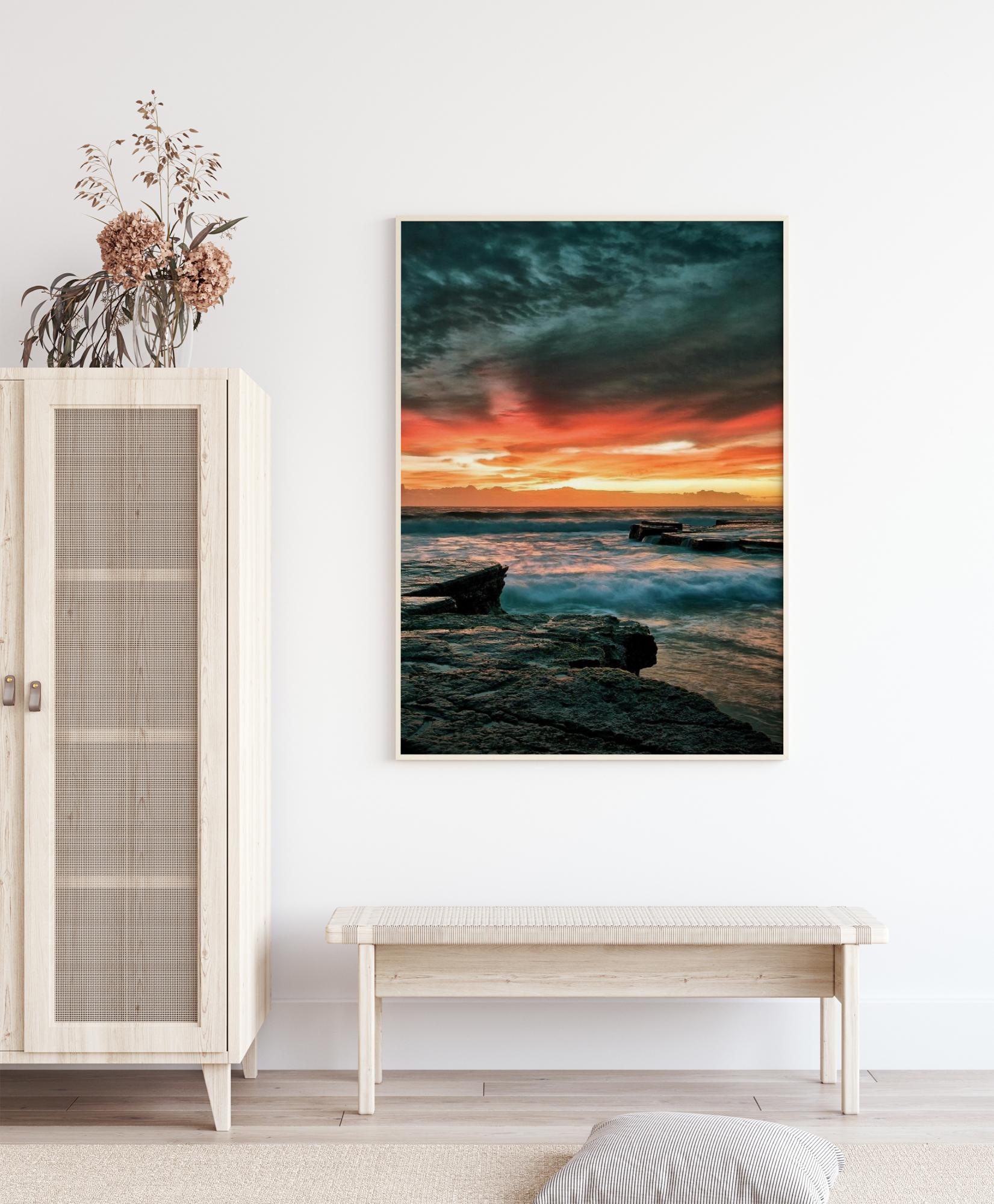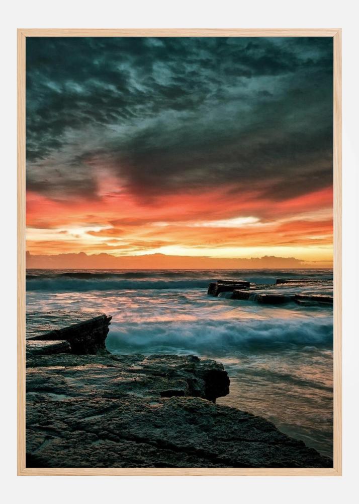 Une affiche d'un coucher de soleil épique, sur l'eau. Les vagues de la mer s'écrasent contre le rivage rocheux plat. Des nuages sombres au-dessus de votre tête et un coucher de soleil rouge vif se profilent à l'horizon, créant une image spectaculaire et impressionnante qui retiendra votre attention.