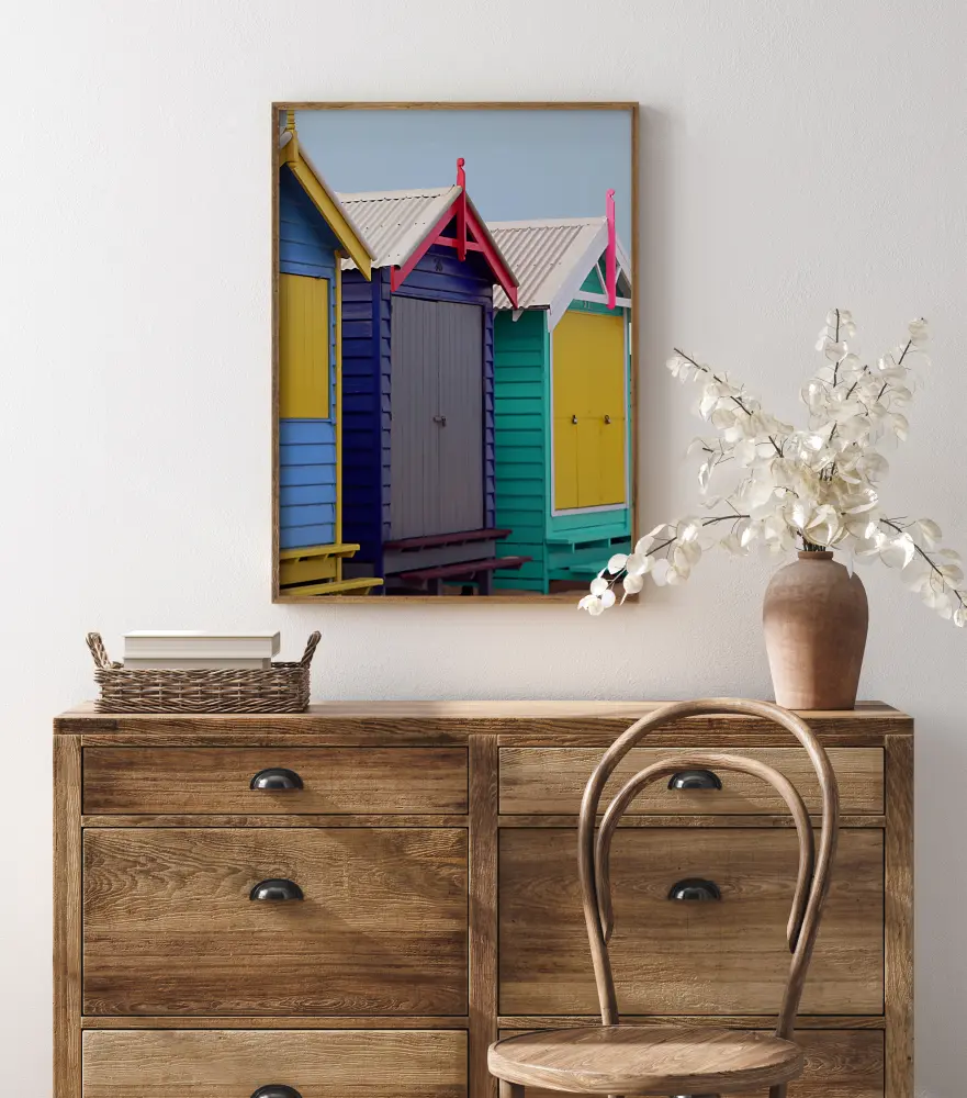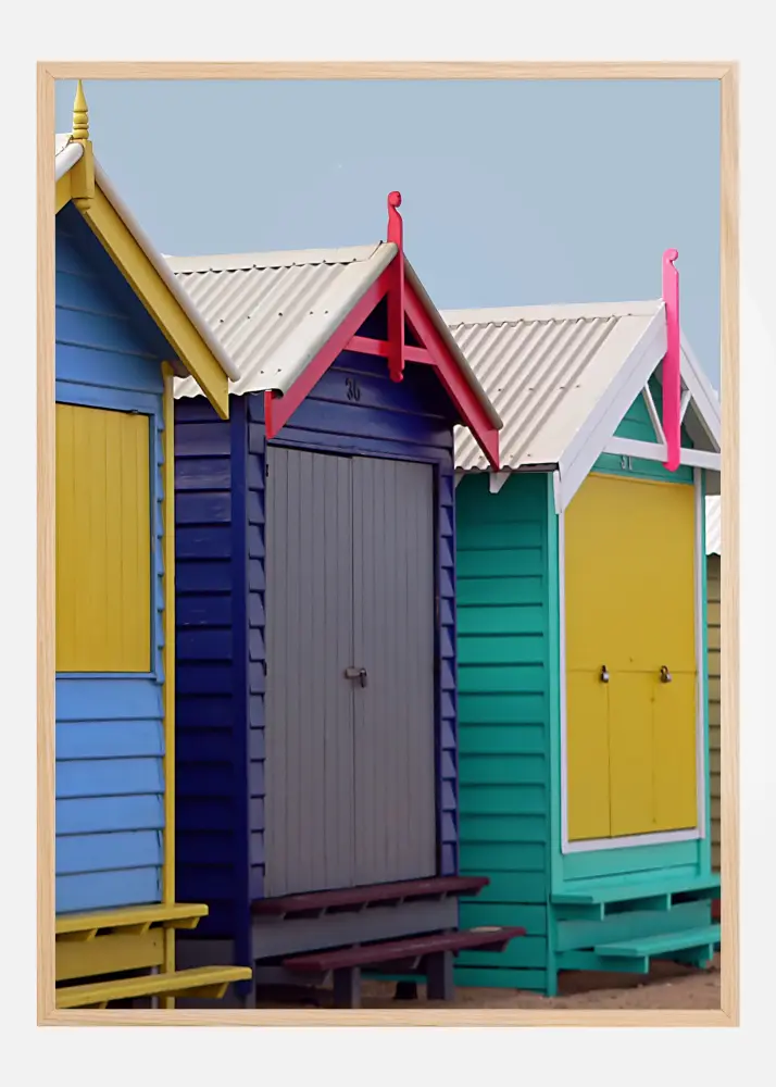 Une affiche lumineuse de cabines de plage colorées. Chacune des cabanes est peinte dans des couleurs vibrantes différentes : jaune, bleu, rose et turquoise. Donnez l'illusion d'être à la plage en été en ajoutant ce poster à un mur banal. Apportez de la couleur à votre maison.