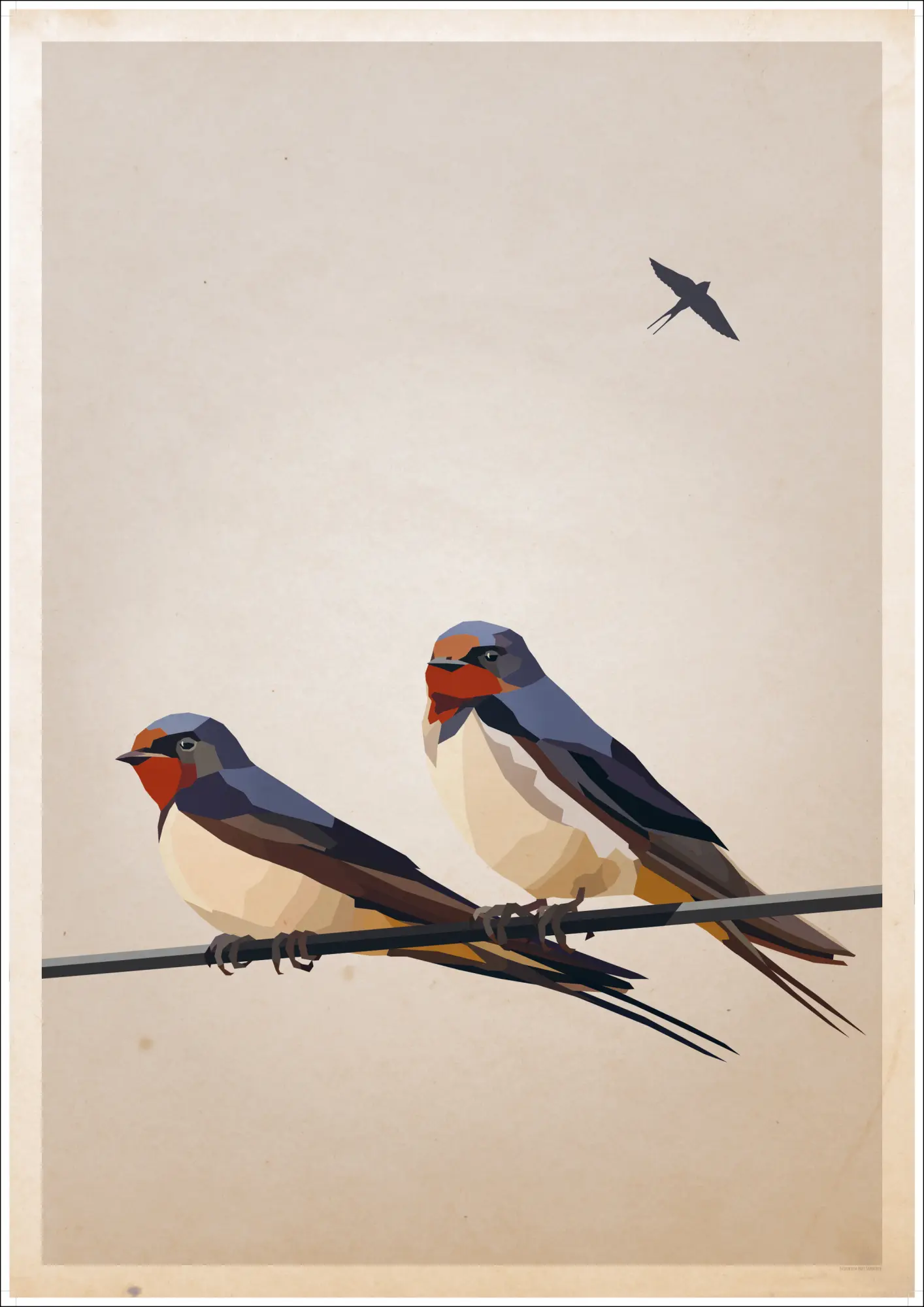 Une affiche animalière représentant trois hirondelles dessinées en blocs de couleur. Deux oiseaux aux joues rouges sont assis sur un seul fil tendu au bas de l'image. Un troisième oiseau s'envole au loin. Le bleu et le rouge vifs des hirondelles seront parfaits sur un mur neutre à la maison.