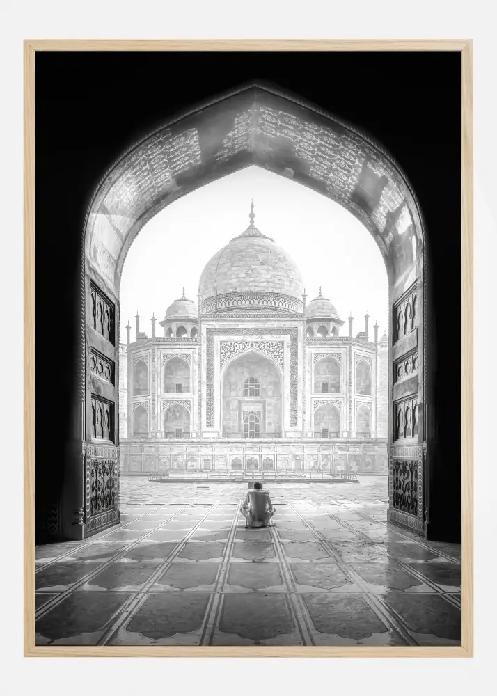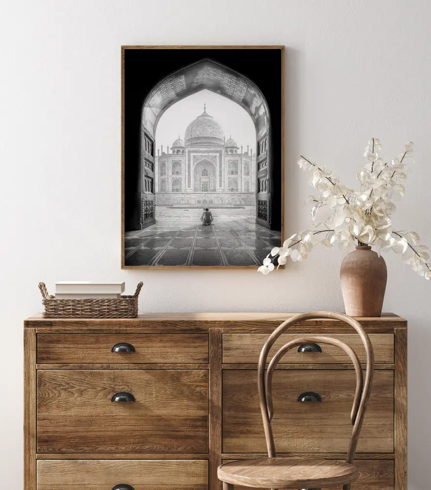 Une affiche architecturale du Taj Mahal en Inde. La prise de vue s'attarde sur le Taj Mahal à travers une arche pointue. Le contraste élevé fait ressortir les détails complexes de l'architecture, ce qui en fait une photo inhabituelle pour ce chef-d'œuvre de marbre blanc. Apportez un peu d'Inde dans votre maison grâce à cette image étonnante.