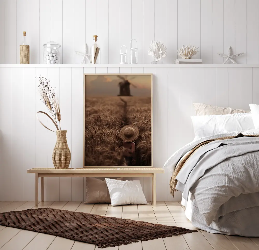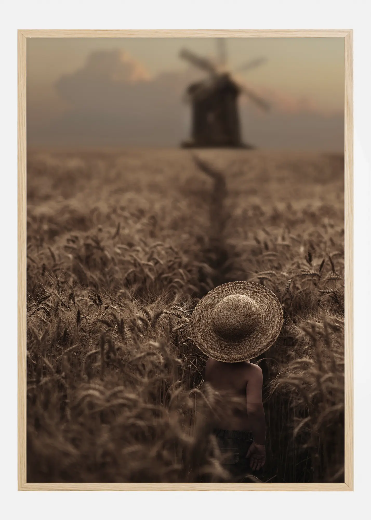 Le portrait d'un enfant dans un champ de blé avec un moulin à vent au loin. Les tons jaunes et roses doux créent un sentiment de tranquilité. Aventurez-vous vers ce moulin à vent et suivez l’enfant de cette affiche.