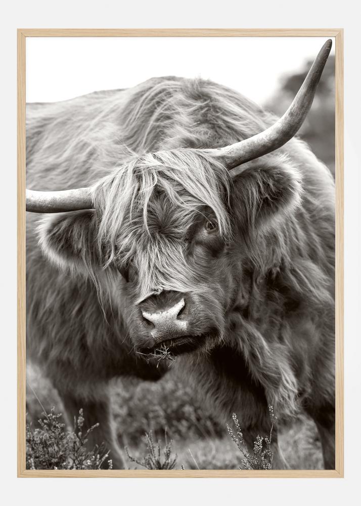 Affiche animalière d'une vache des Highlands. Elle se penche dans le cadre, sa fourrure lui recouvrant les yeux. L'un de ses yeux fixe l'appareil photo, sa fourrure douce et duveteuse captant la lumière au gré de ses mouvements. Malgré ses cornes, le visage de la vache est doux et adorable, on peut presque sentir son nez humide.
