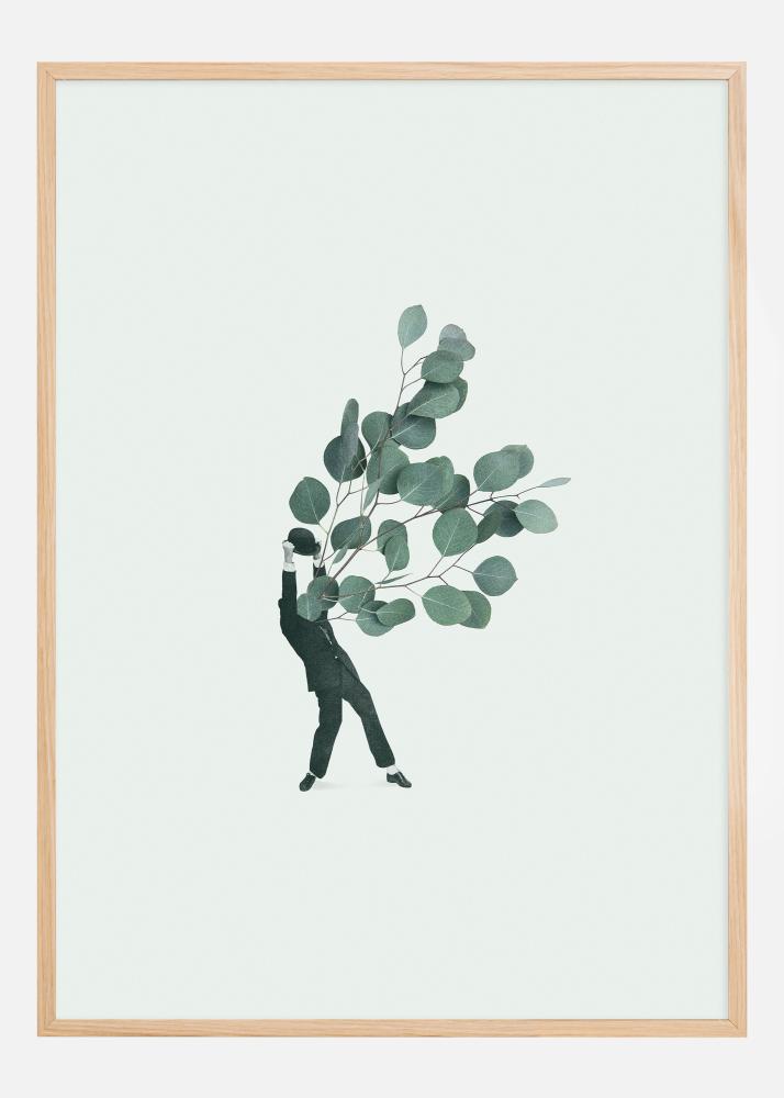Cette affiche artistique et élégante présente une silhouette minimaliste d'une personne portant un bouquet luxuriant de feuilles d'eucalyptus, une expression visuelle aussi simple que puissante. Le contour noir de la figure contraste fortement avec l'arrière-plan clair et les douces nuances vertes des feuilles d'eucalyptus, créant une sensation de nature paisible en harmonie avec la présence humaine.