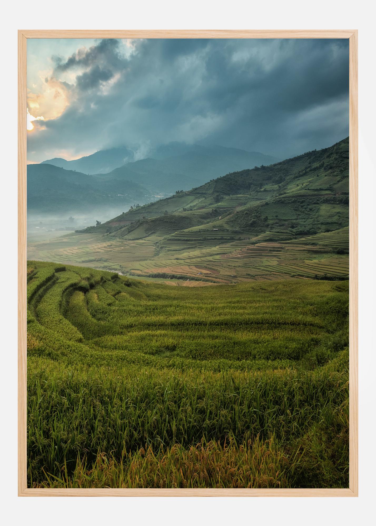 Une superbe affiche de paysage composée de collines et de champs d'un vert éclatant. Des nuages sombres arrivent de la droite et masquent l'une des montagnes au loin. On aperçoit une touche de soleil orange qui donne un ton plus chaud à cette image épique. Obtenez une sensation d'espace dans votre maison avec ce poster.