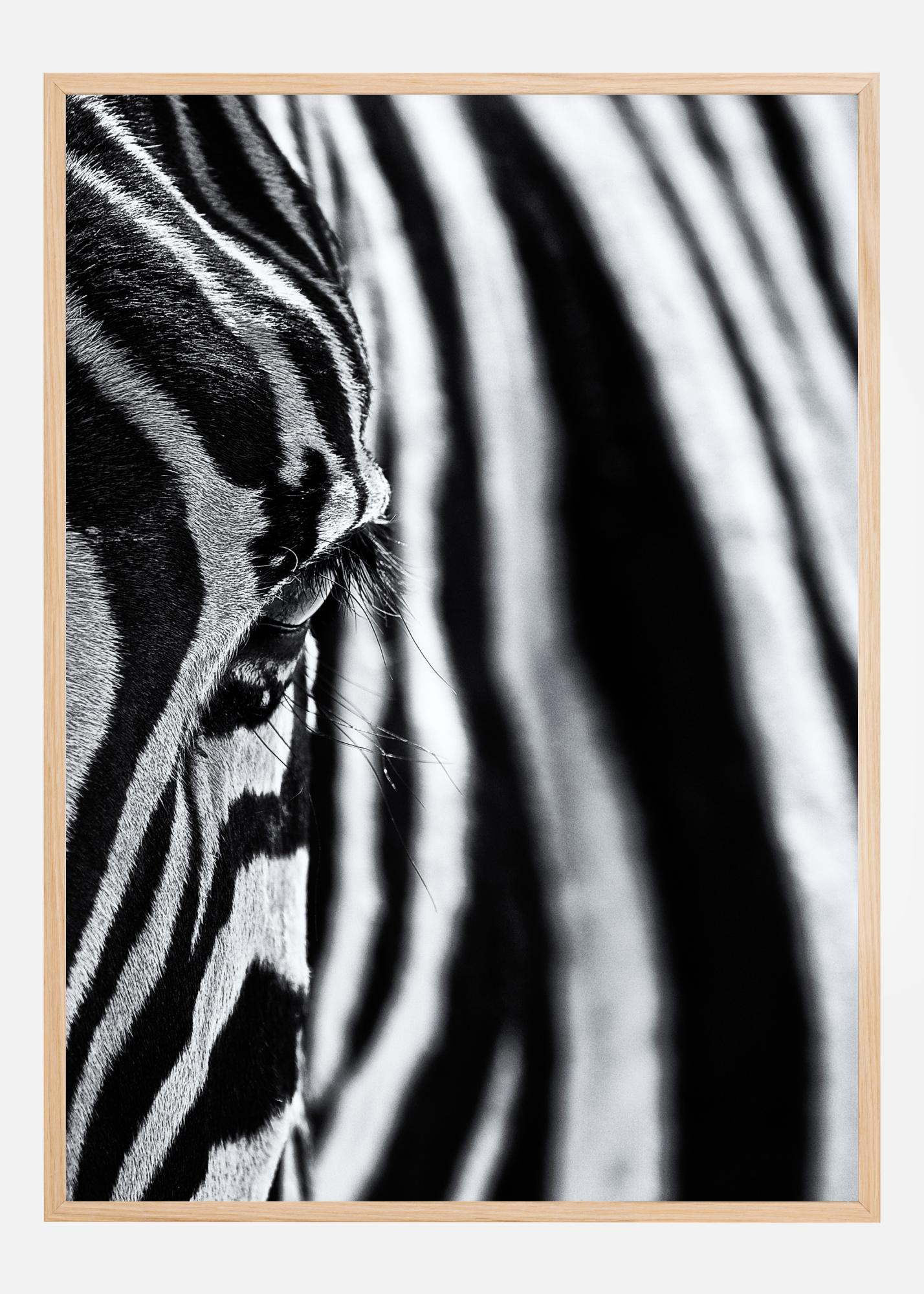 Un gros plan du côté de la tête d'un zèbre. Les épaisses rayures noires et blanches créent des formes géométriques étonnantes qui attirent le regard. L'œil du zèbre et ses cils ajoutent quelque chose d'un peu plus doux à l'image. Ajoutez cette affiche à un mur blanc pour conserver cet effet noir et blanc puissant.