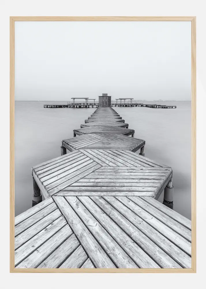 Une affiche amusante représentant une jetée hexagonale qui s'éloigne au loin sur un lac tranquille. L'image est dans des gris sourds, ce qui lui donne un aspect froid plutôt que chaud. La jetée en bois vous mène au loin, où l'accostage vous attend. Associez-la à une couleur vive pour ajouter un peu de chaleur.