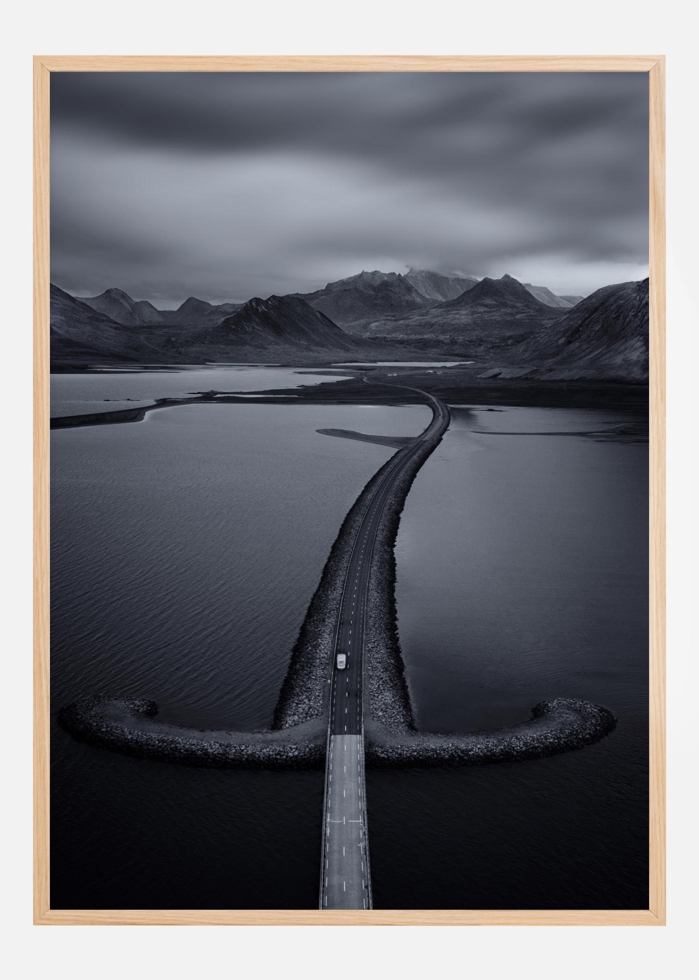 Une affiche en tons gris d'une large route traversant des lacs et des montagnes. Un ciel gris et nuageux flotte au-dessus de nos têtes. Une seule voiture blanche traverse la route au loin. Associez-la à un mur lumineux pour ajouter de la couleur à cette image austère.