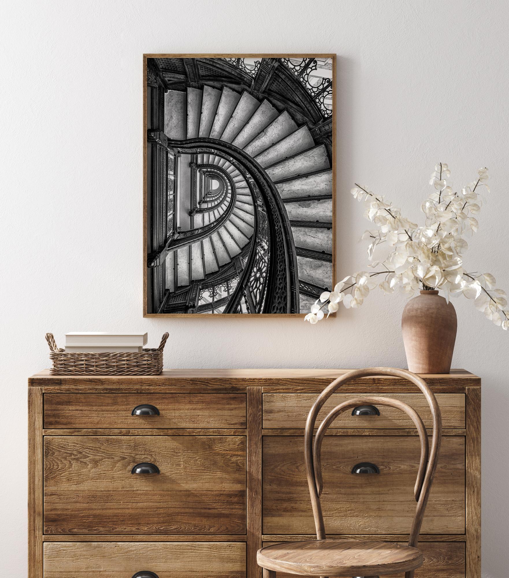 Une affiche intérieure d'escaliers en forme de spirale, descendant jusqu'à la base du bâtiment. Vues d'en haut, les marches s'éloignent. Les rampes conçues en fer forgé sont finement détaillées et se détachent sur les simples marches unies. Les tons et les couleurs contrastés donnent de la profondeur à cette œuvre qui attire les regards.
