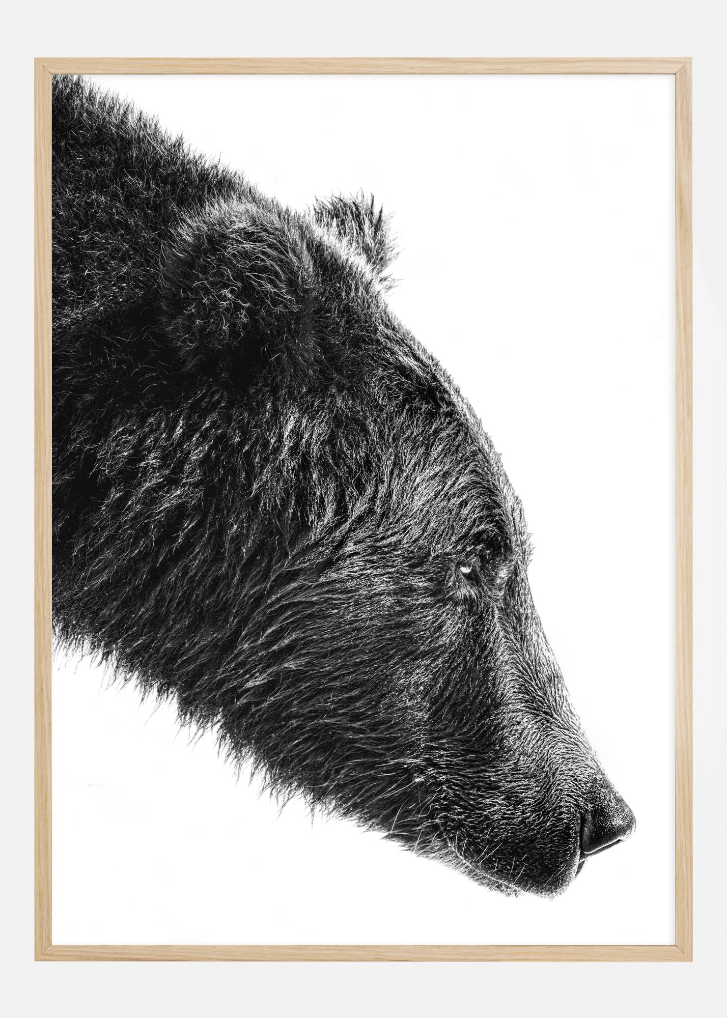 Cette impression élégante et puissante présente un gros plan d'un ours en noir et blanc, un motif qui confère une sensation brute et authentique de l'esprit indomptable de la nature. L'image se concentre sur le profil de l'ours, où chaque détail de la fourrure et les yeux paisibles sont mis en valeur grâce au contraste entre les tons sombres et clairs.
