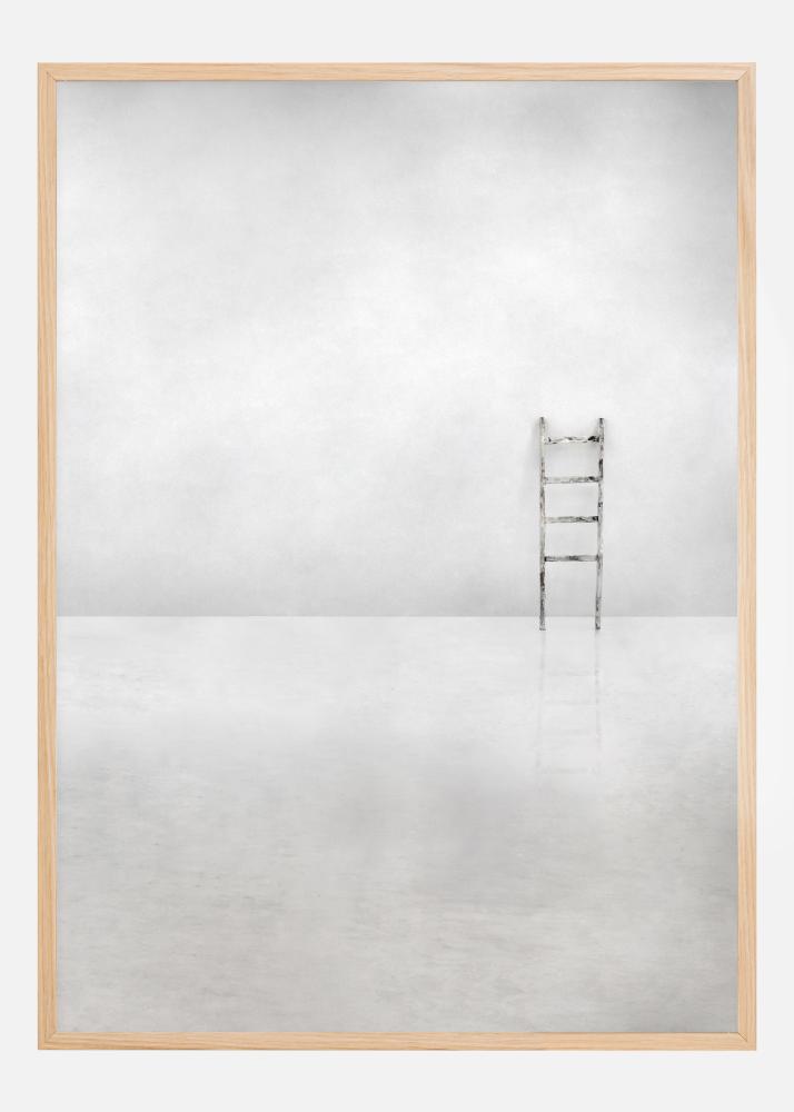 Un poster minimaliste d'une échelle appuyée sur un fond blanc. Surnommée l'Échelle sociale, cette série de marches solitaires est également posée sur un sol blanc. Le mur et le sol sont tous les deux dans les mêmes tons de blanc et de gris. Son échelle est nettement définie dans des tons plus foncés. Amusez-vous à interpréter la signification de cette image.
