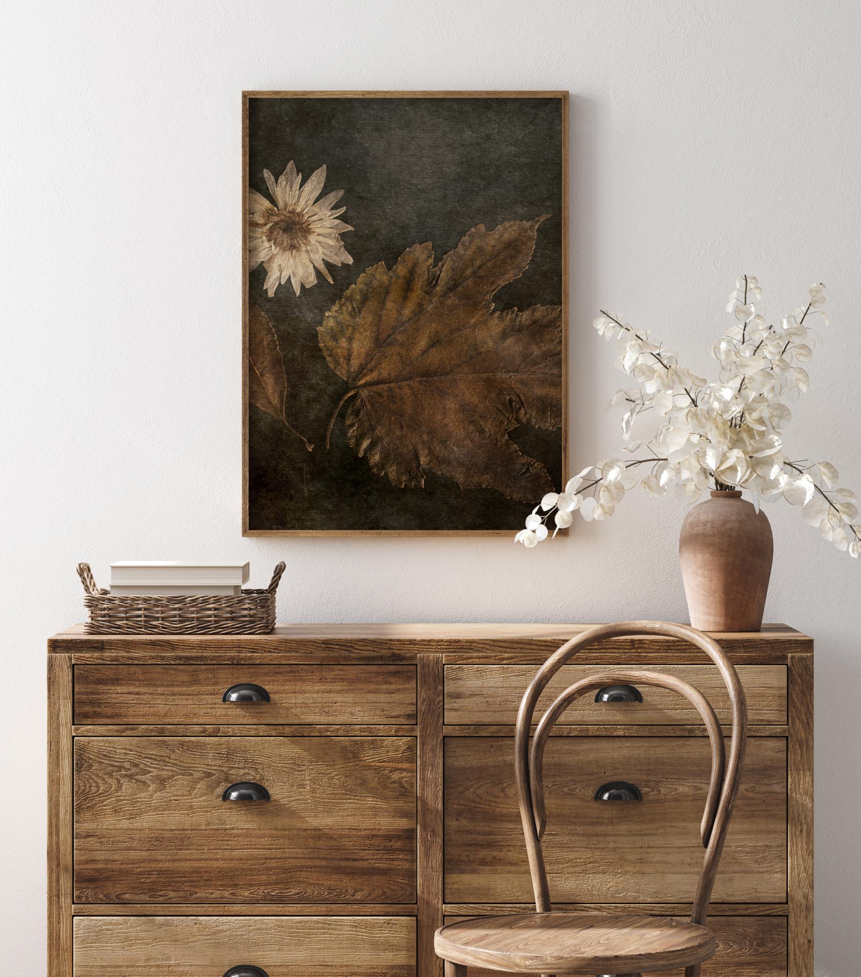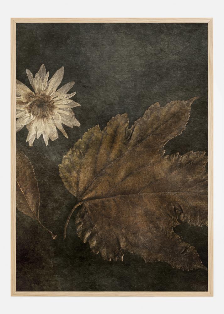 Un poster floral d'une seule fleur agrémenté de deux feuilles. La fleur blanche en forme d'étoile attire le regard en se détachant sur le fond gris foncé. Deux feuilles brunes d'automne l'encadrent, l'une étant un simple ovale, l'autre une feuille plus complexe en forme de sycomore. Regardez attentivement pour absorber les détails des feuilles et des pétales de cette impression botanique étonnante.