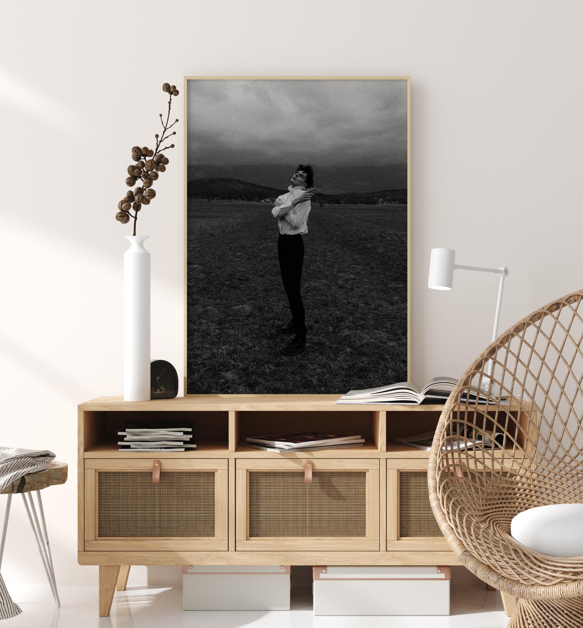 Le portrait d'un homme insouciant au milieu d'un champ ouvert. Les subtiles nuances de noir et de blanc lui donnent un côté naturel. Profitez de cet instant volé capturé à jamais en accrochant cette affiche chez vous.