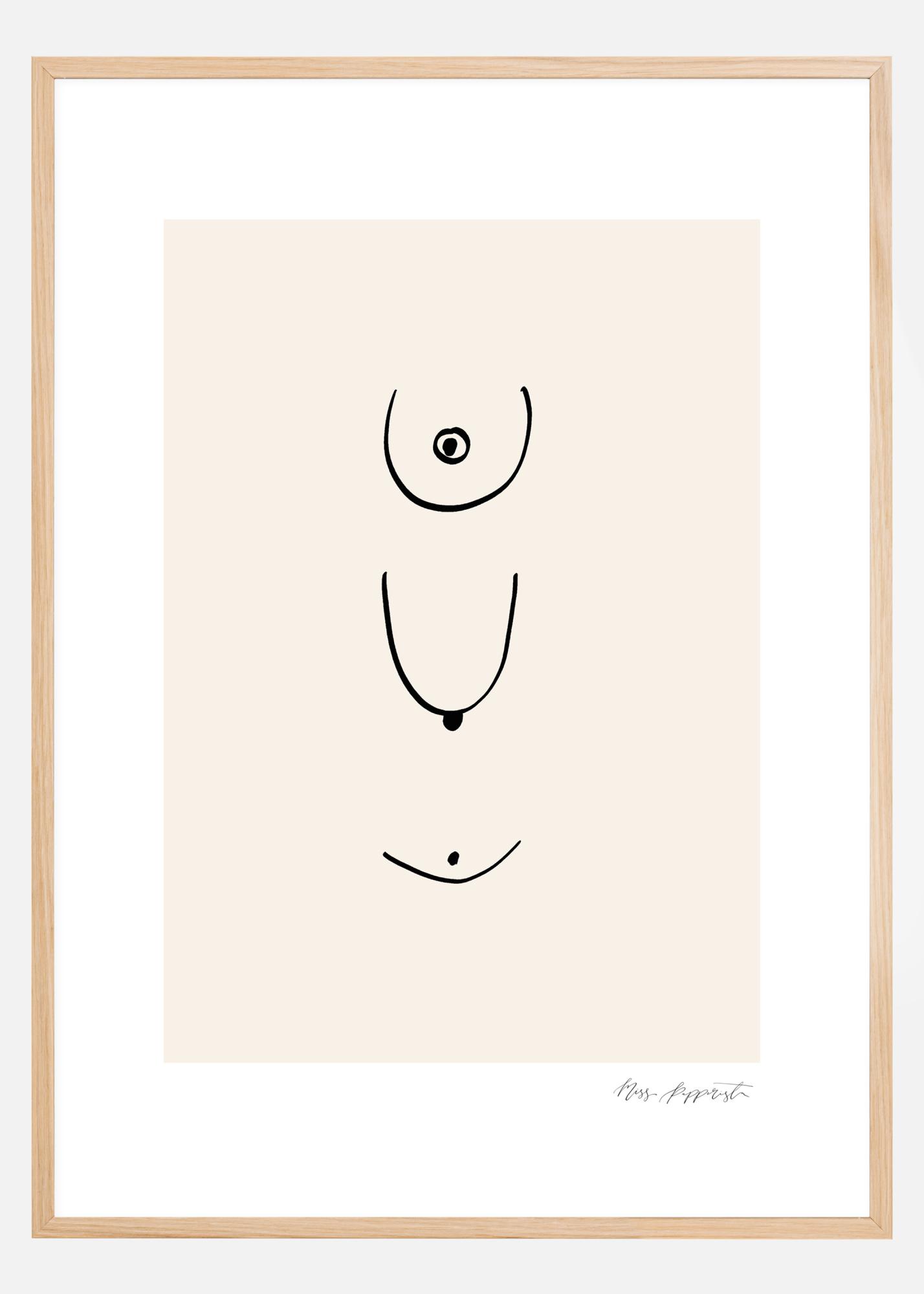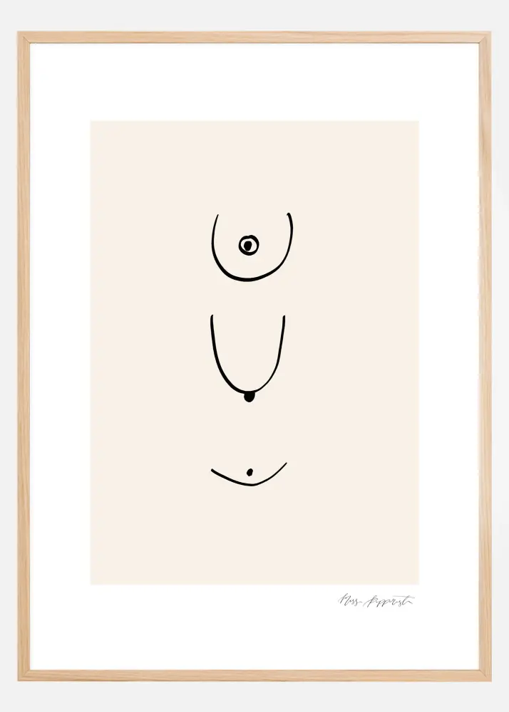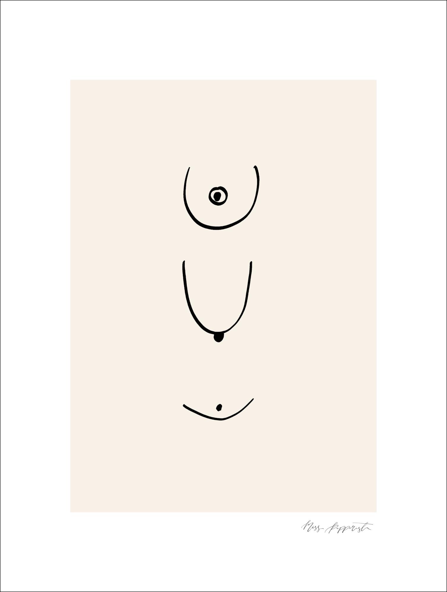 Cette affiche abstraite est composée de différentes lignes noires sur un fond blanc. Les lignes simples semblent dessiner la poitrine d'une femme dans différentes positions et selon différents points de vue. Les lignes sont simples et élégantes. Voyez ce que vous voulez voir dans ces formes courbes.